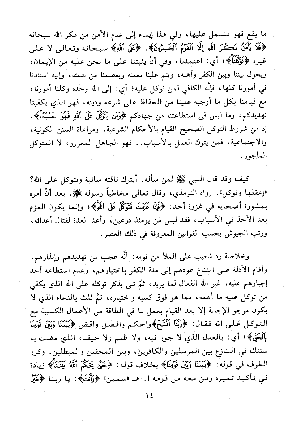 كيف وقد قال النبي صلى الله عليه وسلّم لمن سأله: أيترك ناقته سائبة ويتوكل على الله؟ «إعقلها وتوكل». رواه الترمذي، وقال تعالى مخاطبا رسوله صلى الله عليه وسلّم، بعد أن أمره بمشورة أصحابه في غزوة أحد: {فَإِذا عَزَمْتَ فَتَوَكَّلْ عَلَى اللَّهِ}؛ وإنما يكون العزم بعد الأخذ في الأسباب، فقد لبس من يومئذ در عين، وأعد العدة لقتال أعدائه، ورتب الجيوش بحسب القوانين المعروفة في ذلك العصر.