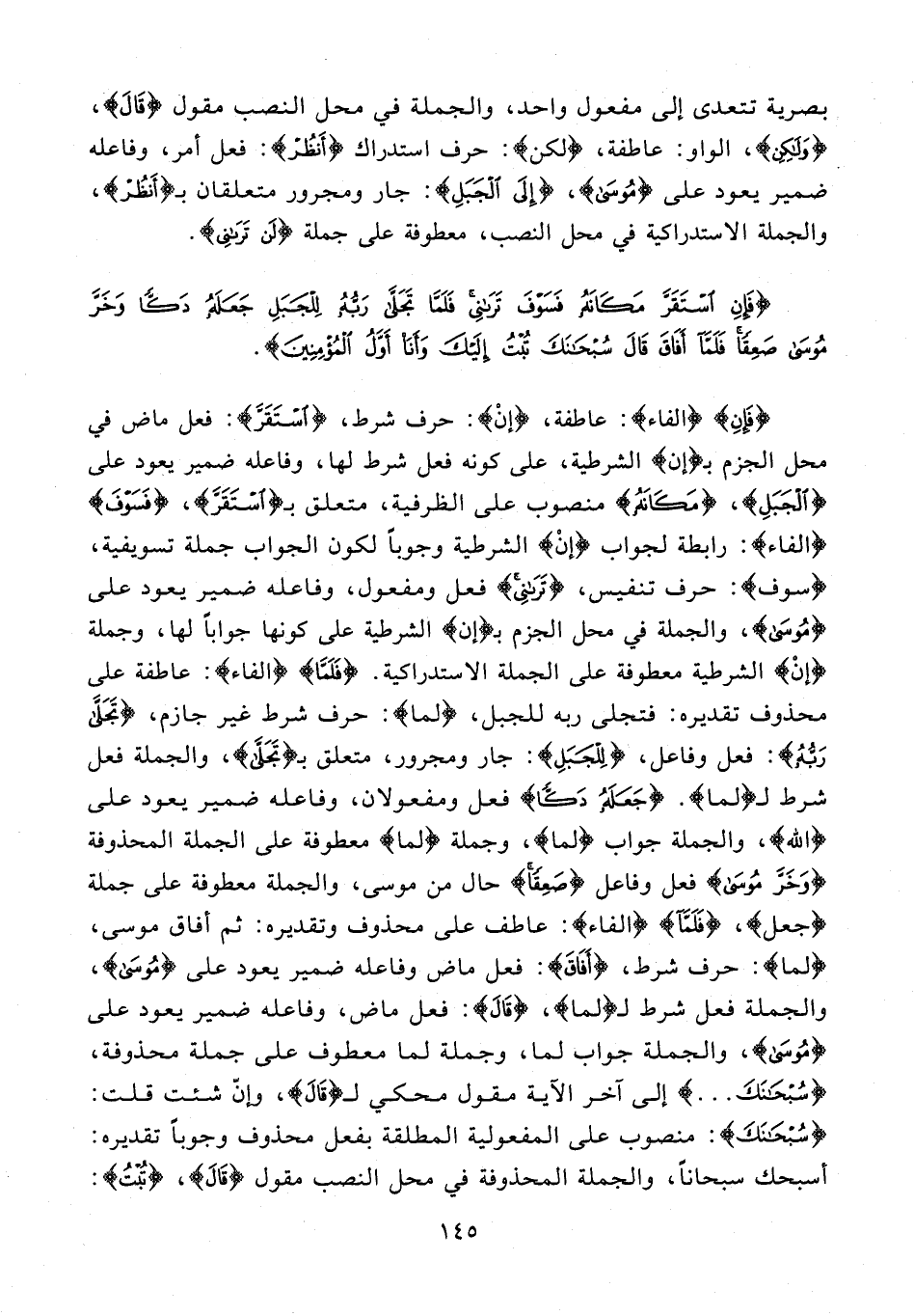 {فَإِنِ} {الفاء}: عاطفة، {إن}: حرف شرط، {اسْتَقَرَّ}: فعل ماض في محل الجزم بـ {إن} الشرطية، على كونه فعل شرط لها، وفاعله ضمير يعود على {الْجَبَلِ}، {مَكانَهُ} منصوب على الظرفية، متعلق بـ {اسْتَقَرَّ}، {فَسَوْفَ} {الفاء}: رابطة لجواب {إن} الشرطية وجوبا لكون الجواب جملة تسويفية، {سوف}: حرف تنفيس، {تَرانِي} فعل ومفعول، وفاعله ضمير يعود على {مُوسى}، والجملة في محل الجزم بـ {إن} الشرطية على كونها جوابا لها، وجملة {إن} الشرطية معطوفة على الجملة الاستدراكية: {فَلَمَّا} {الفاء}: عاطفة على محذوف تقديره: فتجلى ربه للجبل، {لما}: حرف شرط غير جازم، {تَجَلَّى رَبُّهُ}: فعل وفاعل، {لِلْجَبَلِ}: جار ومجرور، متعلق بـ {تَجَلَّى}، والجملة فعل شرط لـ {لما}. {جَعَلَهُ دَكًّا} فعل ومفعولان، وفاعله ضمير يعود على {اللَّهِ}، والجملة جواب {لما}، وجملة {لما} معطوفة على الجملة المحذوفة {وَخَرَّ مُوسى} فعل وفاعل {صَعِقًا} حال من موسى، والجملة معطوفة على جملة {جعل}، {فَلَمَّا} {الفاء}: عاطف على محذوف وتقديره: ثم أفاق موسى، {لما}: حرف شرط، {أَفاقَ}: فعل ماض وفاعله ضمير يعود على {مُوسى}، والجملة فعل شرط لـ {لما}، {قالَ}: فعل ماض، وفاعله ضمير يعود على {مُوسى}، والجملة جواب لما، وجملة لما معطوف على جملة محذوفة، {سُبْحانَكَ} ... إلى آخر الآية مقول محكي لـ {قالَ}، وإنّ شئت قلت: {سُبْحانَكَ}: منصوب على المفعولية المطلقة بفعل محذوف وجوبا تقديره: أسبحك سبحانا، والجملة المحذوفة في محل النصب مقول {قالَ}، {تُبْتُ}: