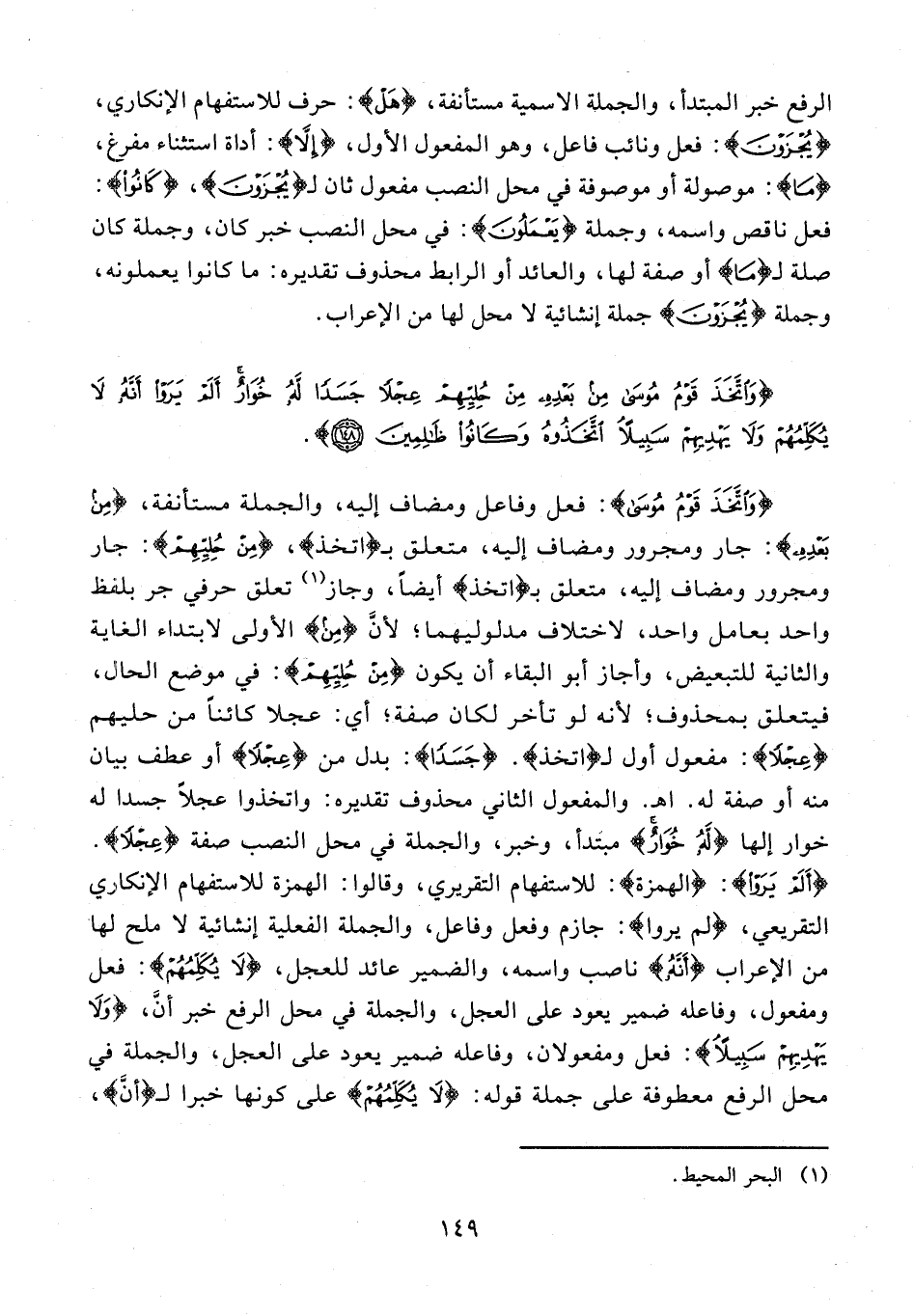 {وَاتَّخَذَ قَوْمُ مُوسى}: فعل وفاعل ومضاف إليه، والجملة مستأنفة، {مِنْ بَعْدِهِ}: جار ومجرور ومضاف إليه، متعلق بـ اتَّخَذَ، {مِنْ حُلِيِّهِمْ}: جار ومجرور ومضاف إليه، متعلق بـ {اتَّخَذَ} أيضا، وجاز (¬1) تعلق حرفي جر بلفظ واحد بعامل واحد، لاختلاف مدلوليهما؛ لأنّ {مِنْ} الأولى لابتداء الغاية والثانية للتبعيض، وأجاز أبو البقاء أن يكون {مِنْ حُلِيِّهِمْ}: في موضع الحال، فيتعلق بمحذوف؛ لأنه لو تأخر لكان صفة؛ أي: عجلا كائنا من حليهم {عِجْلًا}: مفعول أول لـ {اتَّخَذَ}. {جَسَدًا}: بدل من {عِجْلًا} أو عطف بيان منه أو صفة له. اه. والمفعول الثاني محذوف تقديره: واتخذوا عجلا جسدا له خوار إلها {لَهُ خُوارٌ} مبتدأ، وخبر، والجملة في محل النصب صفة {عِجْلًا}. {أَلَمْ يَرَوْا}: {الهمزة}: للاستفهام التقريري، وقالوا: الهمزة للاستفهام الإنكاري التقريعي، {لَمْ يَرَوْا}: جازم وفعل وفاعل، والجملة الفعلية إنشائية لا ملح لها من الإعراب {أَنَّهُ} ناصب واسمه، والضمير عائد للعجل، {لا يُكَلِّمُهُمْ}: فعل ومفعول، وفاعله ضمير يعود على العجل، والجملة في محل الرفع خبر أنّ، {وَلا يَهْدِيهِمْ سَبِيلًا}: فعل ومفعولان، وفاعله ضمير يعود على العجل، والجملة في محل الرفع معطوفة على جملة قوله: {لا يُكَلِّمُهُمْ} على كونها خبرا لـ {أن}،