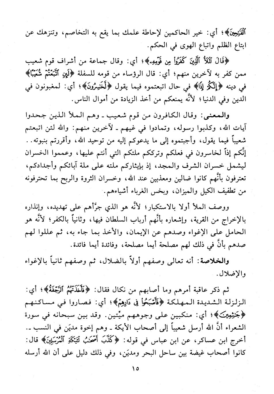 91 - ثم ذكر عاقبة أمرهم وما أصابهم من نكال فقال: {فَأَخَذَتْهُمُ الرَّجْفَةُ}؛ أي: الزلزلة الشديدة المهلكة {فَأَصْبَحُوا فِي دارِهِمْ}؛ أي: فصاروا في مساكنهم {جاثِمِينَ}؛ أي: منكبين على وجوههم ميّتين. وقد بين سبحانه في سورة الشعراء أنّ الله أرسل شعيبا إلى أصحاب الأيكة - وهم إخوة مدين في النسب -. أخرج ابن عساكر، عن ابن عباس في قوله: {كَذَّبَ أَصْحابُ الْأَيْكَةِ الْمُرْسَلِينَ} قال: كانوا أصحاب غيضة بين ساحل البحر ومدين، وفي ذلك دليل على أن الله أرسله