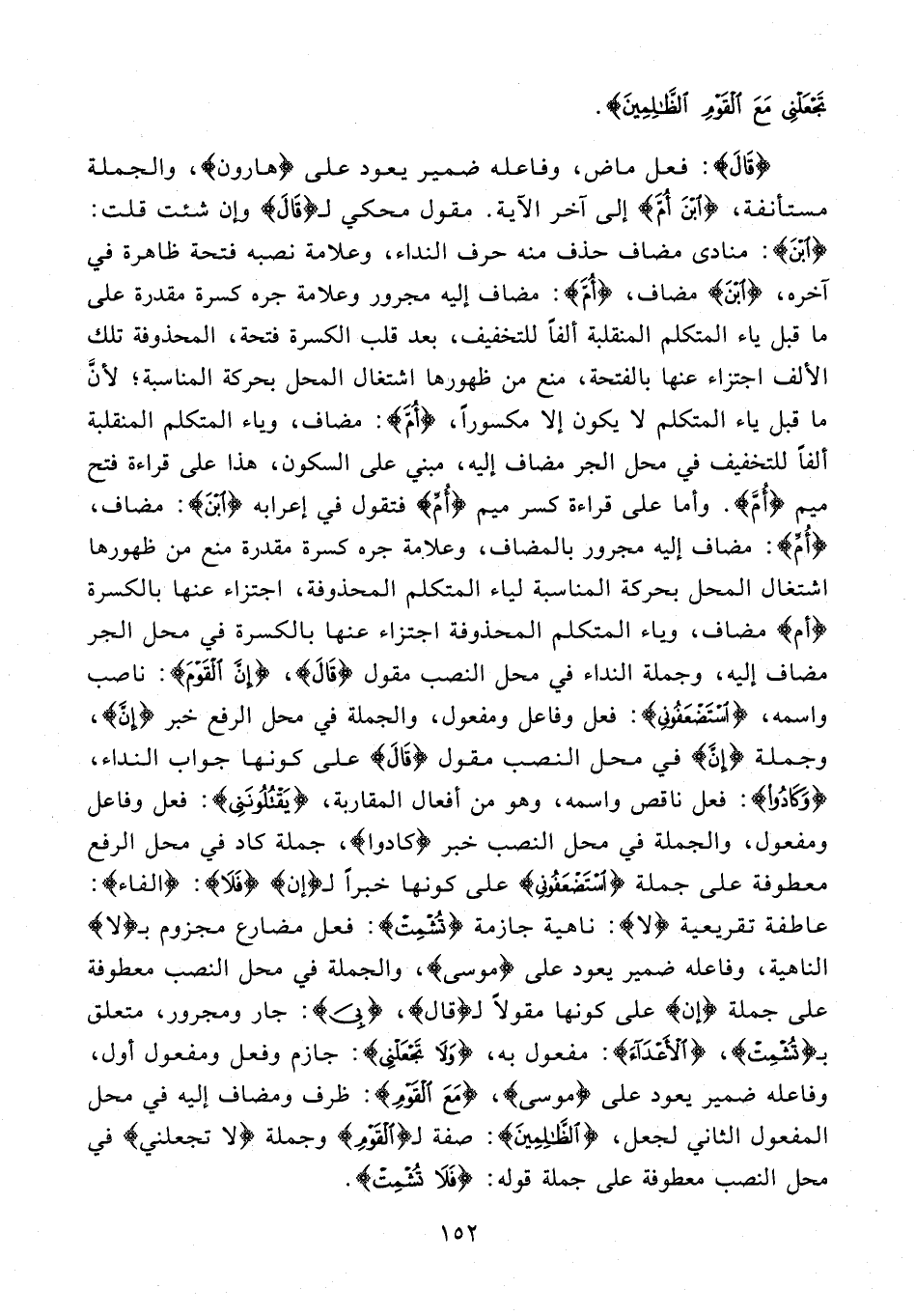 {قالَ}: فعل ماض، وفاعله ضمير يعود على {هارُونَ}، والجملة مستأنفة، {ابْنَ أُمَّ} إلى آخر الآية. مقول محكي لـ {قالَ} وإن شئت قلت: {ابْنَ}: منادى مضاف حذف منه حرف النداء، وعلامة نصبه فتحة ظاهرة في آخره، {ابْنَ} مضاف، {أُمَّ}: مضاف إليه مجرور وعلامة جره كسرة مقدرة على ما قبل ياء المتكلم المنقلبة ألفا للتخفيف، بعد قلب الكسرة فتحة، المحذوفة تلك الألف اجتزاء عنها بالفتحة، منع من ظهورها اشتغال المحل بحركة المناسبة؛ لأنّ ما قبل ياء المتكلم لا يكون إلا مكسورا، {أُمَّ}: مضاف، وياء المتكلم المنقلبة ألفا للتخفيف في محل الجر مضاف إليه، مبني على السكون، هذا على قراءة فتح ميم {أم}. وأما على قراءة كسر ميم {أُمَّ} فتقول في إعرابه {ابْنَ}: مضاف، {أُمَّ}: مضاف إليه مجرور بالمضاف، وعلامة جره كسرة مقدرة منع من ظهورها اشتغال المحل بحركة المناسبة لياء المتكلم المحذوفة، اجتزاء عنها بالكسرة {أُمَّ} مضاف، وياء المتكلم المحذوفة اجتزاء عنها بالكسرة في محل الجر مضاف إليه، وجملة النداء في محل النصب مقول {قالَ}، {إِنَّ الْقَوْمَ}: ناصب واسمه، {اسْتَضْعَفُونِي}: فعل وفاعل ومفعول، والجملة في محل الرفع خبر {إِنَّ}، وجملة {إِنَّ} في محل النصب مقول {قالَ} على كونها جواب النداء، {وَكادُوا}: فعل ناقص واسمه، وهو من أفعال المقاربة، {يَقْتُلُونَنِي}: فعل وفاعل ومفعول، والجملة في محل النصب خبر {كادُوا}، جملة كاد في محل الرفع معطوفة على جملة {اسْتَضْعَفُونِي} على كونها خبرا لـ {إِنَّ} {فَلا}: {الفاء}: عاطفة تقريعية {لا}: ناهية جازمة {تُشْمِتْ}: فعل مضارع مجزوم بـ {لا} الناهية، وفاعله ضمير يعود على {مُوسى}، والجملة في محل النصب معطوفة على جملة {إِنَّ} على كونها مقولا لـ {قالَ}، {بِيَ}: جار ومجرور، متعلق بـ {تُشْمِتْ}، {الْأَعْداءَ}: مفعول به، {وَلا تَجْعَلْنِي}: جازم وفعل ومفعول أول، وفاعله ضمير يعود على {مُوسى}، {مَعَ الْقَوْمِ}: ظرف ومضاف إليه في محل المفعول الثاني لجعل، {الظَّالِمِينَ}: صفة لـ {الْقَوْمَ} وجملة {لا تَجْعَلْنِي} في محل النصب معطوفة على جملة قوله: {فَلا تُشْمِتْ}.