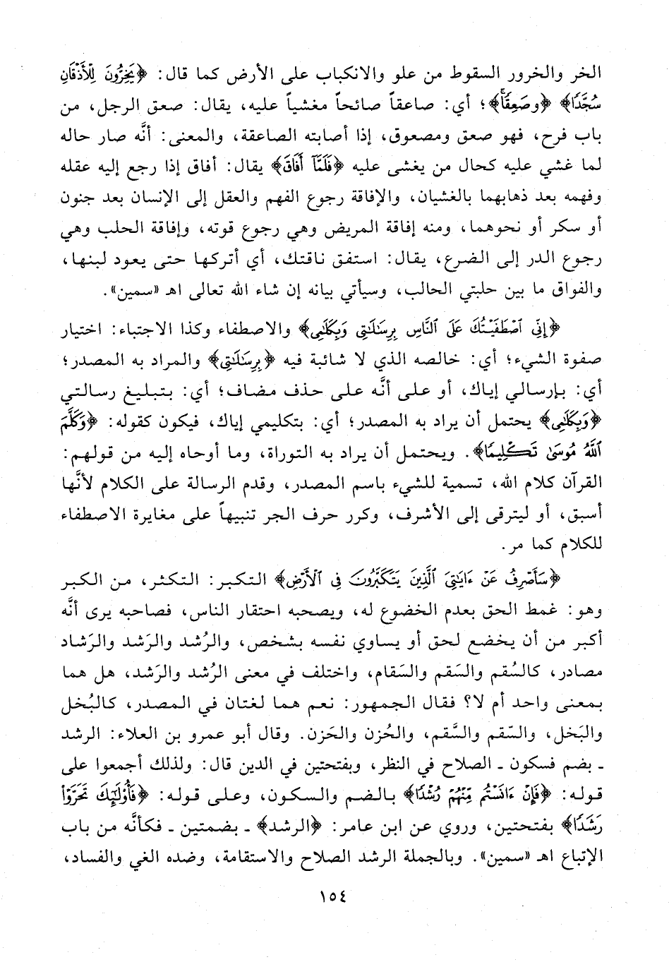 {سَأَصْرِفُ عَنْ آياتِيَ الَّذِينَ يَتَكَبَّرُونَ فِي الْأَرْضِ} التكبر: التكثر، من الكبر وهو: غمط الحق بعدم الخضوع له، ويصحبه احتقار الناس، فصاحبه يرى أنّه أكبر من أن يخضع لحق أو يساوي نفسه بشخص، والرشد والرشد والرشاد مصادر، كالسقم والسقم والسقام، واختلف في معنى الرشد والرشد، هل هما بمعنى واحد أم لا؟ فقال الجمهور: نعم هما لغتان في المصدر، كالبخل والبخل، والسّقم والسّقم، والحزن والحزن. وقال أبو عمرو بن العلاء: الرشد - بضم فسكون - الصلاح في النظر، وبفتحتين في الدين قال: ولذلك أجمعوا على قوله: {فَإِنْ آنَسْتُمْ مِنْهُمْ رُشْدًا} بالضم والسكون، وعلى قوله: {فَأُولئِكَ تَحَرَّوْا رَشَدًا} بفتحتين، وروي عن ابن عامر: {الرشد} - بضمتين - فكأنّه من باب الإتباع اه «سمين». وبالجملة الرشد الصلاح والاستقامة، وضده الغي والفساد،