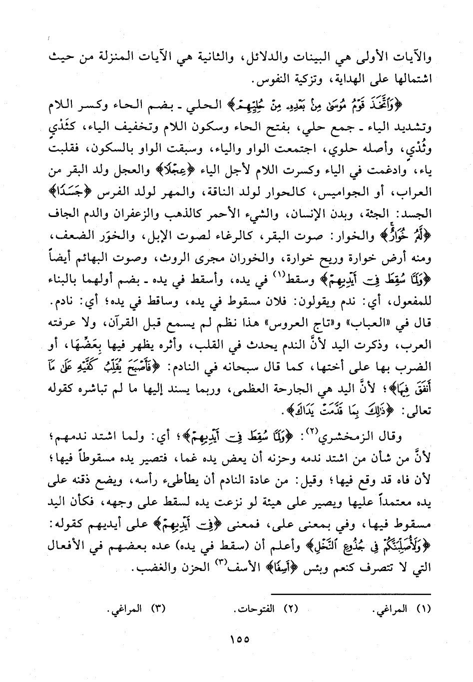 {وَاتَّخَذَ قَوْمُ مُوسى مِنْ بَعْدِهِ مِنْ حُلِيِّهِمْ} الحلي - بضم الحاء وكسر اللام وتشديد الياء - جمع حلي، بفتح الحاء وسكون اللام وتخفيف الياء، كثدي وثدي، وأصله حلوي، اجتمعت الواو والياء، وسبقت الواو بالسكون، فقلبت ياء، وادغمت في الياء وكسرت اللام لأجل الياء {عِجْلًا} والعجل ولد البقر من العراب، أو الجواميس، كالحوار لولد الناقة، والمهر لولد الفرس {جَسَدًا} الجسد: الجثة، وبدن الإنسان، والشيء الأحمر كالذهب والزعفران والدم الجاف {لَهُ خُوارٌ} والخوار: صوت البقر، كالرغاء لصوت الإبل، والخور الضعف، ومنه أرض خوارة وريح خوارة، والخوران مجرى الروث، وصوت البهائم أيضا {وَلَمَّا سُقِطَ فِي أَيْدِيهِمْ} وسقط (¬1) في يده، وأسقط في يده - بضم أولهما بالبناء للمفعول، أي: ندم ويقولون: فلان مسقوط في يده، وساقط في يده؛ أي: نادم.