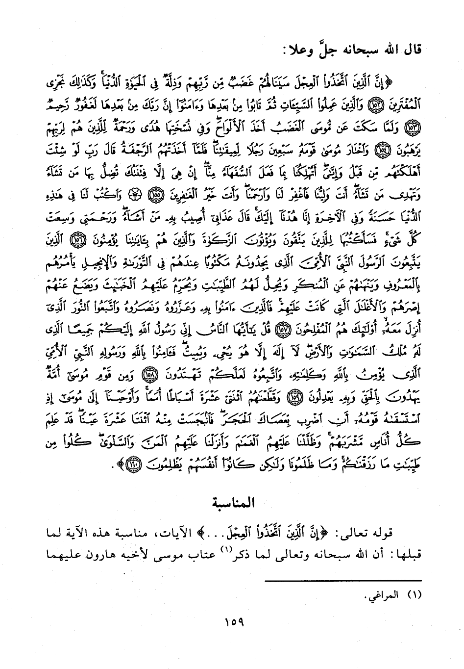 {إِنَّ الَّذِينَ اتَّخَذُوا الْعِجْلَ سَيَنالُهُمْ غَضَبٌ مِنْ رَبِّهِمْ وَذِلَّةٌ فِي الْحَياةِ الدُّنْيا وَكَذلِكَ نَجْزِي الْمُفْتَرِينَ (152) وَالَّذِينَ عَمِلُوا السَّيِّئاتِ ثُمَّ تابُوا مِنْ بَعْدِها وَآمَنُوا إِنَّ رَبَّكَ مِنْ بَعْدِها لَغَفُورٌ رَحِيمٌ (153) وَلَمَّا سَكَتَ عَنْ مُوسَى الْغَضَبُ أَخَذَ الْأَلْواحَ وَفِي نُسْخَتِها هُدىً وَرَحْمَةٌ لِلَّذِينَ هُمْ لِرَبِّهِمْ يَرْهَبُونَ (154) وَاخْتارَ مُوسى قَوْمَهُ سَبْعِينَ رَجُلًا لِمِيقاتِنا فَلَمَّا أَخَذَتْهُمُ الرَّجْفَةُ قالَ رَبِّ لَوْ شِئْتَ أَهْلَكْتَهُمْ مِنْ قَبْلُ وَإِيَّايَ أَتُهْلِكُنا بِما فَعَلَ السُّفَهاءُ مِنَّا إِنْ هِيَ إِلاَّ فِتْنَتُكَ تُضِلُّ بِها مَنْ تَشاءُ وَتَهْدِي مَنْ تَشاءُ أَنْتَ وَلِيُّنا فَاغْفِرْ لَنا وَارْحَمْنا وَأَنْتَ خَيْرُ الْغافِرِينَ (155) وَاكْتُبْ لَنا فِي هذِهِ الدُّنْيا حَسَنَةً وَفِي الْآخِرَةِ إِنَّا هُدْنا إِلَيْكَ قالَ عَذابِي أُصِيبُ بِهِ مَنْ أَشاءُ وَرَحْمَتِي وَسِعَتْ كُلَّ شَيْءٍ فَسَأَكْتُبُها لِلَّذِينَ يَتَّقُونَ وَيُؤْتُونَ الزَّكاةَ وَالَّذِينَ هُمْ بِآياتِنا يُؤْمِنُونَ (156) الَّذِينَ يَتَّبِعُونَ الرَّسُولَ النَّبِيَّ الْأُمِّيَّ الَّذِي يَجِدُونَهُ مَكْتُوبًا عِنْدَهُمْ فِي التَّوْراةِ وَالْإِنْجِيلِ يَأْمُرُهُمْ بِالْمَعْرُوفِ وَيَنْهاهُمْ عَنِ الْمُنْكَرِ وَيُحِلُّ لَهُمُ الطَّيِّباتِ وَيُحَرِّمُ عَلَيْهِمُ الْخَبائِثَ وَيَضَعُ عَنْهُمْ إِصْرَهُمْ وَالْأَغْلالَ الَّتِي كانَتْ عَلَيْهِمْ فَالَّذِينَ آمَنُوا بِهِ وَعَزَّرُوهُ وَنَصَرُوهُ وَاتَّبَعُوا النُّورَ الَّذِي أُنْزِلَ مَعَهُ أُولئِكَ هُمُ الْمُفْلِحُونَ (157) قُلْ يا أَيُّهَا النَّاسُ إِنِّي رَسُولُ اللَّهِ إِلَيْكُمْ جَمِيعًا الَّذِي لَهُ مُلْكُ السَّماواتِ وَالْأَرْضِ لا إِلهَ إِلاَّ هُوَ يُحيِي وَيُمِيتُ فَآمِنُوا بِاللَّهِ وَرَسُولِهِ النَّبِيِّ الْأُمِّيِّ الَّذِي يُؤْمِنُ بِاللَّهِ وَكَلِماتِهِ وَاتَّبِعُوهُ لَعَلَّكُمْ تَهْتَدُونَ (158) وَمِنْ قَوْمِ مُوسى أُمَّةٌ يَهْدُونَ بِالْحَقِّ وَبِهِ يَعْدِلُونَ (159) وَقَطَّعْناهُمُ اثْنَتَيْ عَشْرَةَ أَسْباطًا أُمَمًا وَأَوْحَيْنا إِلى مُوسى إِذِ اسْتَسْقاهُ قَوْمُهُ أَنِ اضْرِبْ بِعَصاكَ الْحَجَرَ فَانْبَجَسَتْ مِنْهُ اثْنَتا عَشْرَةَ عَيْنًا قَدْ عَلِمَ كُلُّ أُناسٍ مَشْرَبَهُمْ وَظَلَّلْنا عَلَيْهِمُ الْغَمامَ وَأَنْزَلْنا عَلَيْهِمُ الْمَنَّ وَالسَّلْوى كُلُوا مِنْ طَيِّباتِ ما رَزَقْناكُمْ وَما ظَلَمُونا وَلكِنْ كانُوا أَنْفُسَهُمْ يَظْلِمُونَ (160)}.