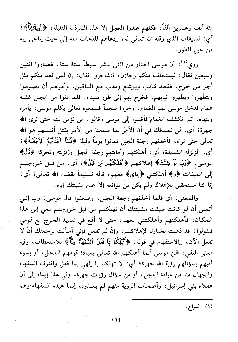 روي (¬1): أن موسى اختار من اثني عشر سبطا ستة ستة، فصاروا اثنين وسبعين فقال: ليستخلف منكم رجلان، فتشاجروا فقال: إن لمن قعد منكم مثل أجر من خرج، فقعد كالب ويوشع وذهب مع الباقين، وأمرهم أن يصوموا ويتطهروا ويطهروا ثيابهم، فخرج بهم إلى طور سيناء. فلما دنوا من الجبل غشيه غمام فدخل موسى بهم الغمام، وخروا سجدا فسمعوه تعالى يكلم موسى، يأمره وينهاه، ثم انكشف الغمام فأقبلوا إلى موسى وقالوا: لن نؤمن لك حتى نرى الله جهرة؛ أي: لن نصدقك في أن الآمر بما سمعنا من الأمر بقتل أنفسهم هو الله تعالى حتى نراه، فأخذتهم رجفة الجبل فماتوا يوما وليلة {فَلَمَّا أَخَذَتْهُمُ الرَّجْفَةُ}؛ أي: الزلزلة الشديدة؛ أي: أهلكتهم وأماتتهم رجفة الجبل وزلزلته وتحركه {قالَ} موسى: {رَبِّ لَوْ شِئْتَ} إهلاكهم {أَهْلَكْتَهُمْ مِنْ قَبْلُ}؛ أي: من قبل خروجهم إلى الميقات {وَ} أهلكتني {إِيَّايَ} معهم، قاله تسليما لقضاء الله تعالى؛ أي: إنا كنا مستحقين للإهلاك ولم يكن من موانعه إلا عدم مشيئتك إياه.