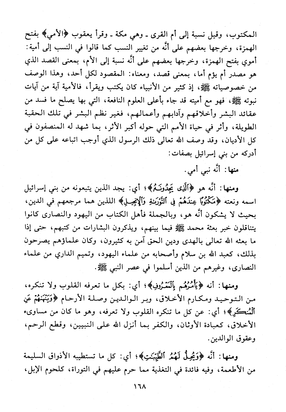 المكتوب، وقيل نسبة إلى أم القرى - وهي مكة - وقرأ يعقوب {الأمي} بفتح الهمزة، وخرجها بعضهم على أنّه من تغيير النسب كما قالوا في النسب إلى أمية: أموي بفتح الهمزة، وخرجها بعضهم على أنّه نسبة إلى الأم، بمعنى القصد الذي هو مصدر أم يؤم أما، بمعنى قصد، ومعناه: المقصود لكل أحد، وهذا الوصف من خصوصياته صلى الله عليه وسلّم، إذ كثير من الأنبياء كان يكتب ويقرأ، فالأمية آية من آيات نبوته صلى الله عليه وسلّم، فهو مع أميته قد جاء بأعلى العلوم النافعة، التي بها يصلح ما فسد من عقائد البشر وأخلاقهم وآدابهم وأعمالهم، فغير نظم البشر في تلك الحقبة الطويلة، وأثر في حياة الأمم التي حوله أكبر الأثر، بما شهد له المنصفون في كل الأديان، وقد وصف الله تعالى ذلك الرسول الذي أوجب اتباعه على كل من أدركه من بني إسرائيل بصفات: