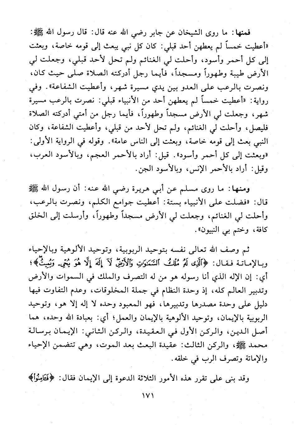 «أعطيت خمسا لم يعطهن أحد قبلي: كان كل نبي يبعث إلى قومه خاصة، وبعثت إلى كل أحمر وأسود، وأحلت لي الغنائم ولم تحل لأحد قبلي، وجعلت لي الأرض طيبة وطهورا ومسجدا، فأيما رجل أدركته الصلاة صلى حيث كان، ونصرت بالرعب على العدو بين يدي مسيرة شهر، وأعطيت الشفاعة». وفي رواية: «أعطيت خمسا لم يعطهن أحد من الأنبياء قبلي: نصرت بالرعب مسيرة شهر، وجعلت لي الأرض مسجدا وطهورا، فأيما رجل من أمتي أدركته الصلاة فليصل، وأحلت لي الغنائم، ولم تحل لأحد من قبلي، وأعطيت الشفاعة، وكان النبي بعث إلى قومه خاصة، وبعثت إلى الناس عامة». وقوله في الرواية الأولى: «وبعثت إلى كل أحمر وأسود». قيل: أراد بالأحمر العجم، وبالأسود العرب، وقيل: أراد بالأحمر الإنس، وبالأسود الجن.