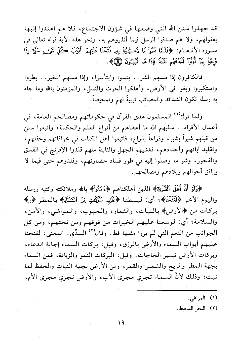 ولما ترك (¬1) المسلمون هدى القرآن في حكوماتهم ومصالحهم العامة، في أعمال الأفراد .. سلبهم الله ما أعطاهم من أنواع العلم والحكمة، واتبعوا سنن من قبلهم شبرا بشبر، وذراعا بذراع، فاتبعوا أهل الكتاب في خرافاتهم وحفلهم، وتقليد آبائهم وأجدادهم، فغشيهم الجهل والثابتة منهم قلدوا الإفرنج في الفسق والفجور، وشر ما وصلوا إليه في طور فساد حضارتهم، وقلدوهم حتى فيما لا يوافق أحوالهم وبلادهم ومصالحهم.