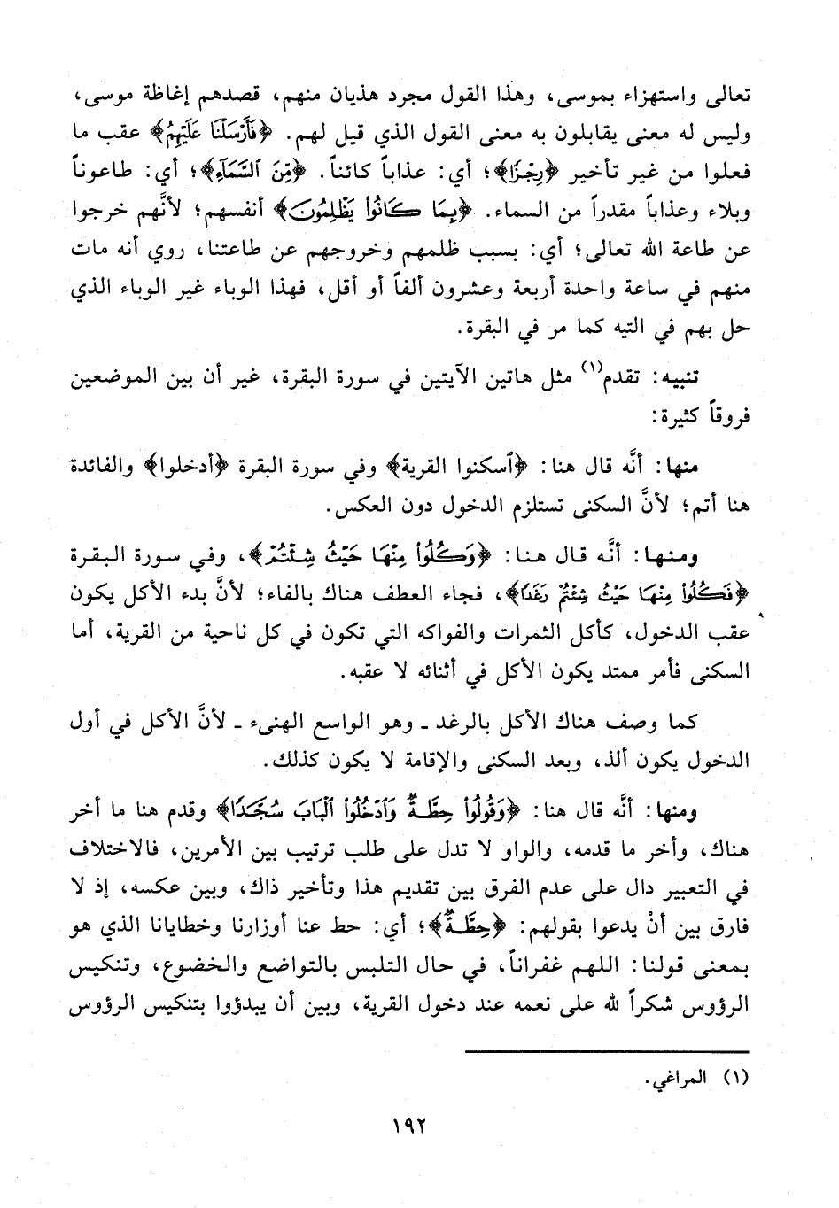 ومنها: أنّه قال هنا: {وَقُولُوا حِطَّةٌ وَادْخُلُوا الْبابَ سُجَّدًا} وقدم هنا ما أخر هناك، وأخر ما قدمه، والواو لا تدل على طلب ترتيب بين الأمرين، فالاختلاف في التعبير دال على عدم الفرق بين تقديم هذا وتأخير ذاك، وبين عكسه، إذ لا فارق بين أن يدعوا بقولهم: {حِطَّةٌ}؛ أي: حط عنا أوزارنا وخطايانا الذي هو بمعنى قولنا: اللهم غفرانا، في حال التلبس بالتواضع والخضوع، وتنكيس الرؤوس شكرا لله على نعمه عند دخول القرية، وبين أن يبدؤوا بتنكيس الرؤوس