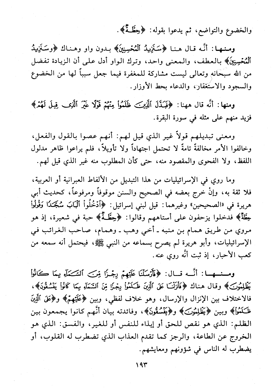 وما روي في الإسرائيليات من هذا التبديل من الألفاط العبرانية أو العربية، فلا ثقة به، وإن خرج بعضه في الصحيح والسنن موقوفا ومرفوعا، كحديث أبي هريرة في «الصحيحين» وغيرهما: قيل لبني إسرائيل: {ادْخُلُوا الْبابَ سُجَّدًا وَقُولُوا حِطَّةٌ} فدخلوا يزحفون على أستاههم وقالوا: {حِطَّةٌ} حبة في شعيرة، إذ هو مروي من طريق همام بن منبه - أخي وهب - وهمام، صاحب الغرائب في الإسرائيليات، وأبو هريرة لم يصرح بسماعه من النبي صلى الله عليه وسلّم، فيحتمل أنه سمعه من كعب الأحبار، إذ ثبت أنّه روي عنه.