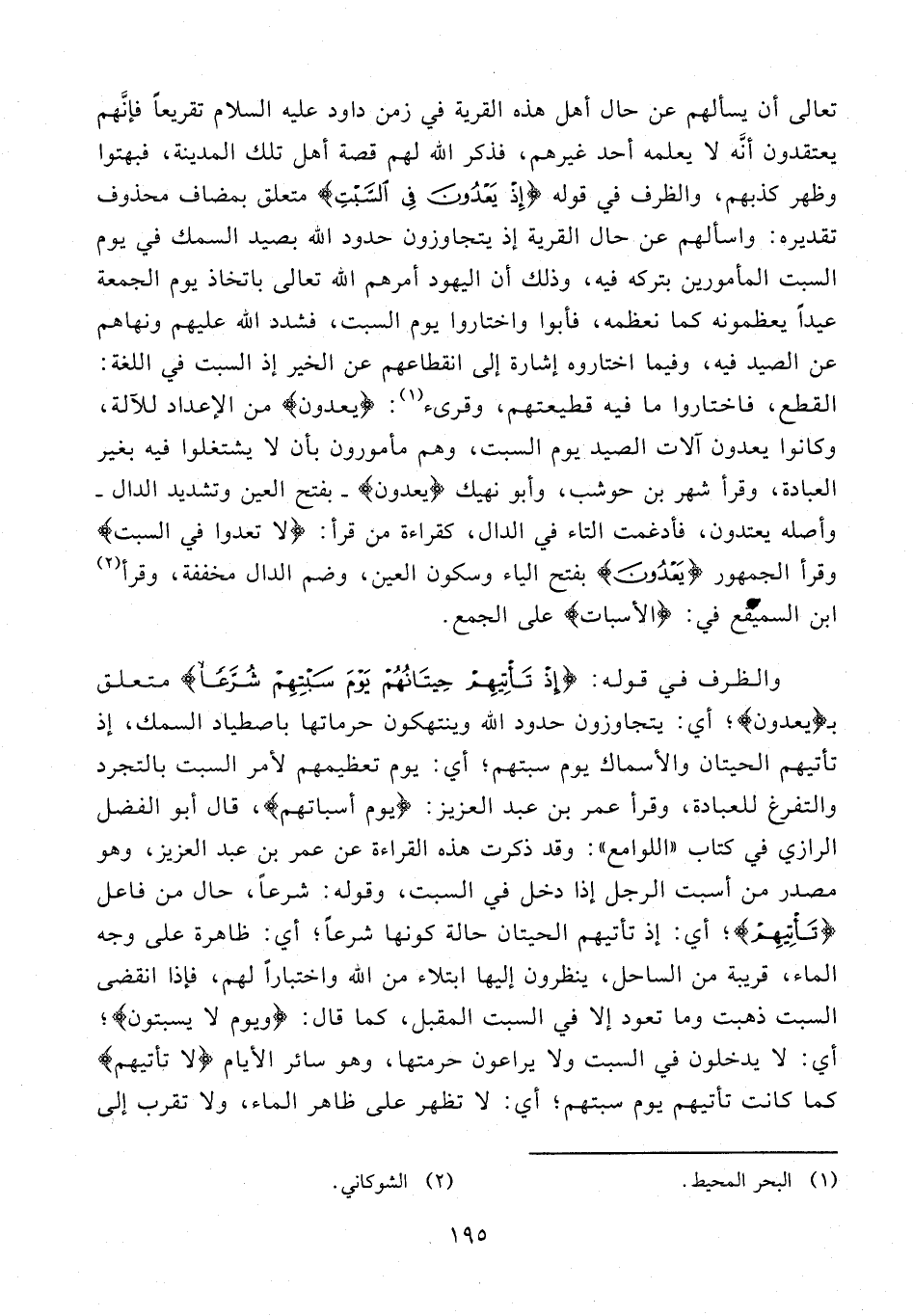 تعالى أن يسألهم عن حال أهل هذه القرية في زمن داود عليه السلام تقريعا فإنّهم يعتقدون أنّه لا يعلمه أحد غيرهم، فذكر الله لهم قصة أهل تلك المدينة، فبهتوا وظهر كذبهم، والظرف في قوله {إِذْ يَعْدُونَ فِي السَّبْتِ} متعلق بمضاف محذوف تقديره: واسألهم عن حال القرية إذ يتجاوزون حدود الله بصيد السمك في يوم السبت المأمورين بتركه فيه، وذلك أن اليهود أمرهم الله تعالى باتخاذ يوم الجمعة عيدا يعظمونه كما نعظمه، فأبوا واختاروا يوم السبت، فشدد الله عليهم ونهاهم عن الصيد فيه، وفيما اختاروه إشارة إلى انقطاعهم عن الخير إذ السبت في اللغة: القطع، فاختاروا ما فيه قطيعتهم، وقرىء (¬1): {يَعْدُونَ} من الإعداد للآلة، وكانوا يعدون آلات الصيد يوم السبت، وهم مأمورون بأن لا يشتغلوا فيه بغير العبادة، وقرأ شهر بن حوشب، وأبو نهيك {يَعْدُونَ} - بفتح العين وتشديد الدال - وأصله يعتدون، فأدغمت التاء في الدال، كقراءة من قرأ: {لا تَعْدُوا فِي السَّبْتِ} وقرأ الجمهور {يَعْدُونَ} بفتح الياء وسكون العين، وضم الدال مخففة، وقرأ (¬2) ابن السميقع في: {الأسبات} على الجمع.