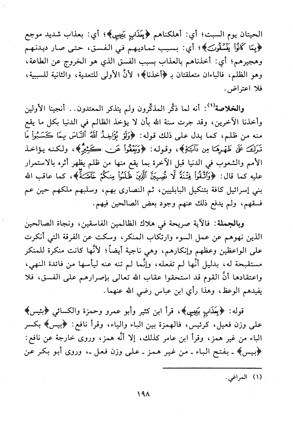 والخلاصة (¬1): أنه لما ذكّر المذكّرون ولم يتذكر المعتدون .. أنجينا الأولين وأخذنا الآخرين، وقد جرت سنة الله بأن لا يؤخذ الظالم في الدنيا بكل ما يقع منه من ظلم، كما يدل على ذلك قوله: {وَلَوْ يُؤاخِذُ اللَّهُ النَّاسَ بِما كَسَبُوا ما تَرَكَ عَلى ظَهْرِها مِنْ دَابَّةٍ}، وقوله: {وَيَعْفُوا عَنْ كَثِيرٍ}، ولكنه يؤاخذ الأمم والشعوب في الدنيا قبل الآخرة بما يقع منها من ظلم يظهر أثره بالاستمرار عليه كما قال: {وَاتَّقُوا فِتْنَةً لا تُصِيبَنَّ الَّذِينَ ظَلَمُوا مِنْكُمْ خَاصَّةً}، كما عاقب الله بني إسرائيل كافة بتنكيل البابليين، ثم النصارى بهم، وسلبهم ملكهم حين عم فسقهم، ولم يدفع ذلك عنهم وجود بعض الصالحين فيهم.
