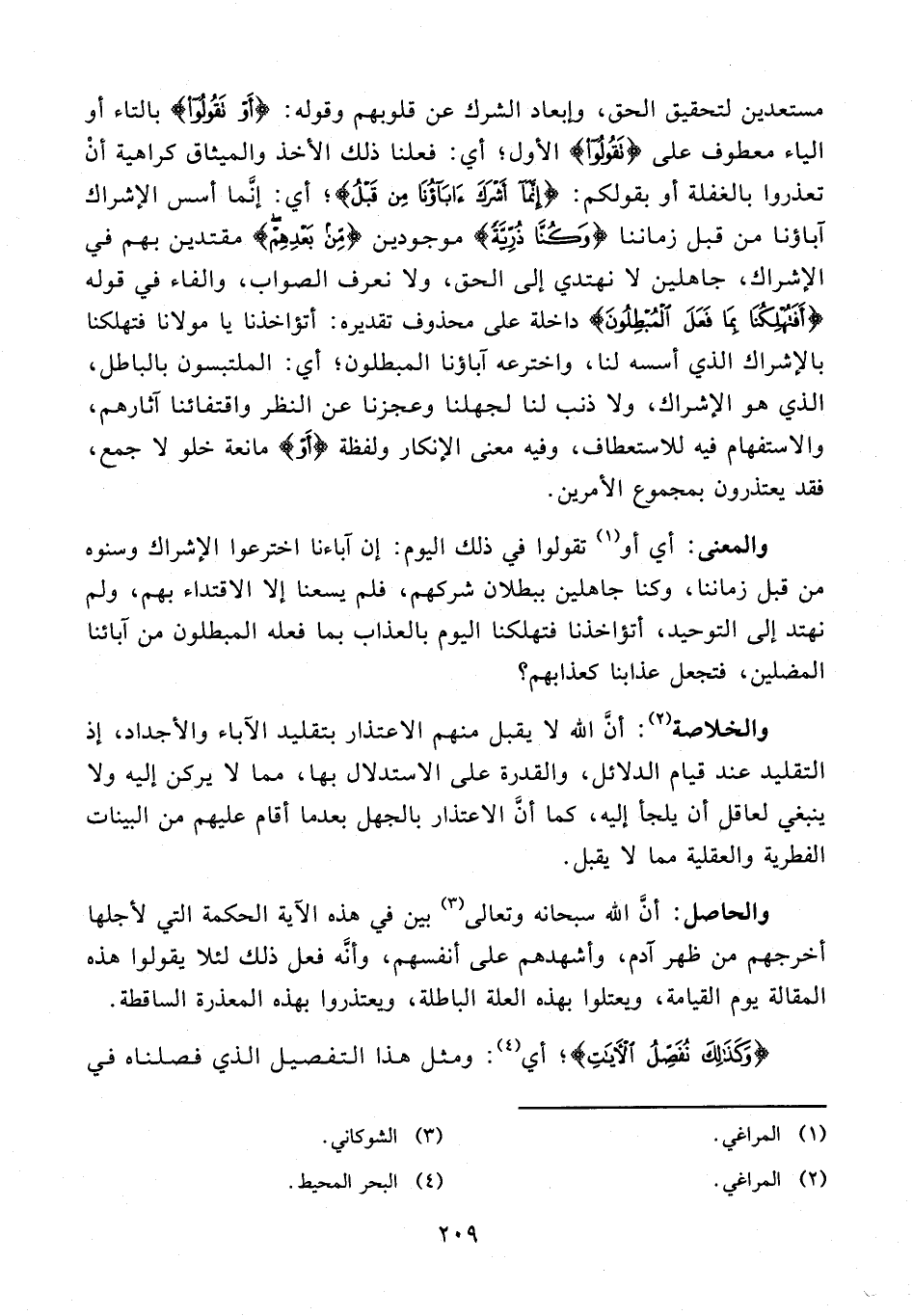 والحاصل: أنّ الله سبحانه وتعالى (¬3) بين في هذه الآية الحكمة التي لأجلها أخرجهم من ظهر آدم، وأشهدهم على أنفسهم، وأنّه فعل ذلك لئلا يقولوا هذه المقالة يوم القيامة، ويعتلوا بهذه العلة الباطلة، ويعتذروا بهذه المعذرة الساقطة.