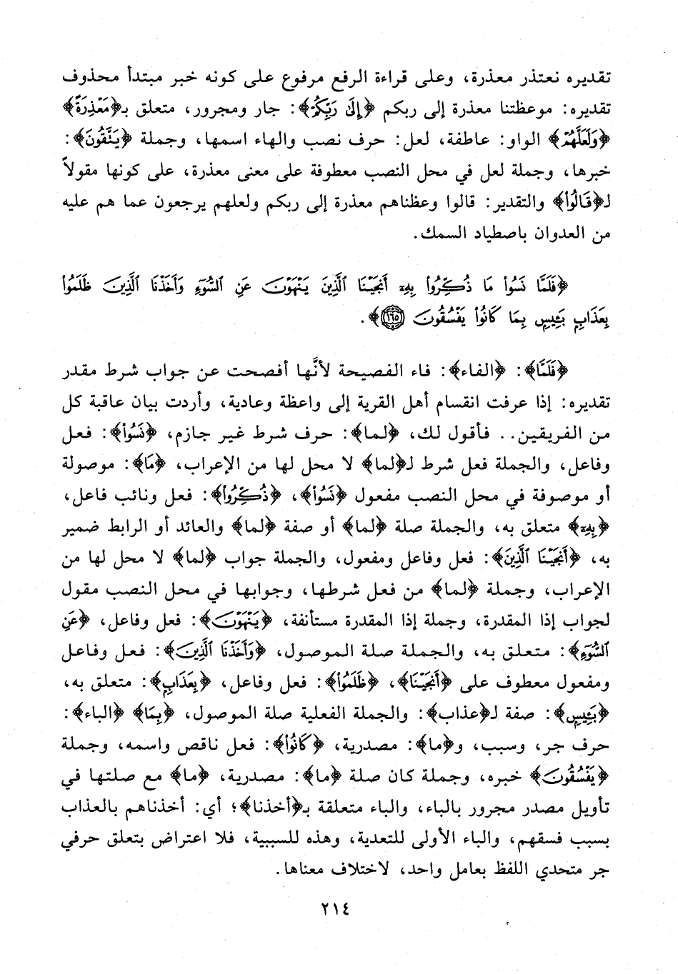 {فَلَمَّا}: {الفاء}: فاء الفصيحة لأنّها أفصحت عن جواب شرط مقدر تقديره: إذا عرفت انقسام أهل القرية إلى واعظة وعادية، وأردت بيان عاقبة كل من الفريقين .. فأقول لك، {لما}: حرف شرط غير جازم، {نَسُوا}: فعل وفاعل، والجملة فعل شرط لـ {لما} لا محل لها من الإعراب، {ما}: موصولة أو موصوفة في محل النصب مفعول {نَسُوا}، {ذُكِّرُوا}: فعل ونائب فاعل، بِهِ متعلق به، والجملة صلة {لما} أو صفة {لما} والعائد أو الرابط ضمير به، {أَنْجَيْنَا الَّذِينَ}: فعل وفاعل ومفعول، والجملة جواب {لما} لا محل لها من الإعراب، وجملة {لما} من فعل شرطها، وجوابها في محل النصب مقول لجواب إذا المقدرة، وجملة إذا المقدرة مستأنفة، {يَنْهَوْنَ}: فعل وفاعل، {عَنِ السُّوءِ}: متعلق به، والجملة صلة الموصول، {وَأَخَذْنَا الَّذِينَ}: فعل وفاعل ومفعول معطوف على {أَنْجَيْنَا}، {ظَلَمُوا}: فعل وفاعل، {بِعَذابٍ}: متعلق به، {بَئِيسٍ}: صفة لـ {عذاب}: والجملة الفعلية صلة الموصول، {بِما} {الباء}: حرف جر، وسبب، و {ما}: مصدرية، {كانُوا}: فعل ناقص واسمه، وجملة {يَفْسُقُونَ} خبره، وجملة كان صلة {ما}: مصدرية، {ما} مع صلتها في تأويل مصدر مجرور بالباء، والباء متعلقة بـ {أَخَذْنَا}؛ أي: أخذناهم بالعذاب بسبب فسقهم، والباء الأولى للتعدية، وهذه للسببية، فلا اعتراض بتعلق حرفي جر متحدي اللفظ بعامل واحد، لاختلاف معناها.