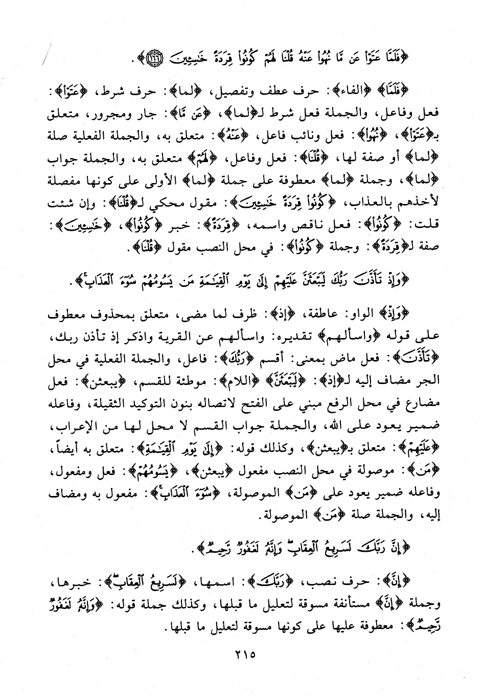 {فَلَمَّا} {الفاء}: حرف عطف وتفصيل، {لما}: حرف شرط، {عَتَوْا}: فعل وفاعل، والجملة فعل شرط لـ {لما}، {عَنْ ما}: جار ومجرور، متعلق بـ {عَتَوْا}، {نُهُوا}: فعل ونائب فاعل، {عَنْهُ}: متعلق به، والجملة الفعلية صلة {لما} أو صفة لها، {قُلْنا}: فعل وفاعل، {لَهُمْ} متعلق به، والجملة جواب {لما}، وجملة {لما} معطوفة على جملة {لما} الأولى على كونها مفصلة لأخذهم بالعذاب، {كُونُوا قِرَدَةً خاسِئِينَ}: مقول محكي لـ {قُلْنا}: وإن شئت قلت: {كُونُوا}: فعل ناقص واسمه، {قِرَدَةً}: خبر {كُونُوا}، {خاسِئِينَ}: صفة لـ {قِرَدَةً}: وجملة {كُونُوا}: في محل النصب مقول {قُلْنا}.