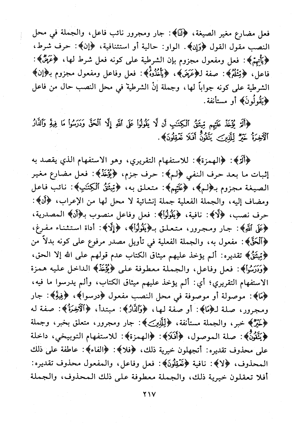 {أَلَمْ}: {الهمزة}: للاستفهام التقريري، وهو الاستفهام الذي يقصد به إثبات ما بعد حرف النفي {لَمْ}: حرف جزم، {يُؤْخَذْ}: فعل مضارع مغير الصيغة مجزوم بـ {لَمْ}، {عَلَيْهِمْ}: متعلق به، {مِيثاقُ الْكِتابِ}: نائب فاعل ومضاف إليه، والجملة الفعلية جملة إنشائية لا محل لها من الإعراب، {إِنْ}: حرف نصب، {لا}: نافية، {يَقُولُوا}: فعل وفاعل منصوب بـ {إِنْ} المصدرية، {عَلَى اللَّهِ}: جار ومجرور، متعلق بـ {يَقُولُوا}، {إِلَّا}: أداة استثناء مفرغ، {الْحَقَّ}: مفعول به، والجملة الفعلية في تأويل مصدر مرفوع على كونه بدلا من {مِيثاقُ} تقديره: ألم يؤخذ عليهم ميثاق الكتاب عدم قولهم على الله إلا الحق، {وَدَرَسُوا}: فعل وفاعل، والجملة معطوفة على {يُؤْخَذْ} الداخل عليه همزة الاستفهام التقريري؛ أي: ألم يؤخذ عليهم ميثاق الكتاب، وألم يدرسوا ما فيه، ما: موصولة أو موصوفة في محل النصب مفعول {دَرَسُوا}، {فِيهِ}: جار ومجرور، صلة لـ {ما}: أو صفة لها، {وَالدَّارُ}: مبتدأ، {الْآخِرَةُ}: صفة له {خَيْرٌ} خبر، والجملة مستأنفة، {لِلَّذِينَ}: جار ومجرور، متعلق بخبر، وجملة {يَتَّقُونَ}: صلة الموصول، {أَفَلا}: {الهمزة}: للاستفهام التوبيخي، داخلة على محذوف تقديره: أتجهلون خيرية ذلك، {فَلا}: {الفاء}: عاطفة على ذلك المحذوف، {لا}: نافية {تَعْقِلُونَ}: فعل وفاعل، والمفعول محذوف تقديره: أفلا تعقلون خيرية ذلك، والجملة معطوفة على ذلك المحذوف، والجملة