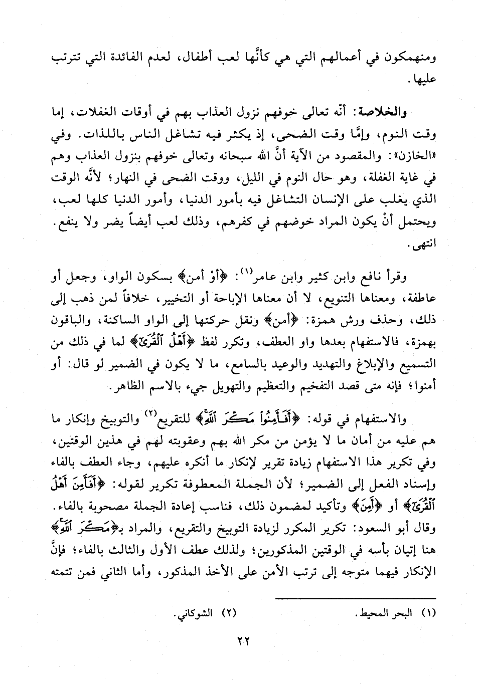 99 - والاستفهام في قوله: {أَفَأَمِنُوا مَكْرَ اللَّهِ} للتقريع (¬2) والتوبيخ وإنكار ما هم عليه من أمان ما لا يؤمن من مكر الله بهم وعقوبته لهم في هذين الوقتين، وفي تكرير هذا الاستفهام زيادة تقرير لإنكار ما أنكره عليهم، وجاء العطف بالفاء وإسناد الفعل إلى الضمير؛ لأن الجملة المعطوفة تكرير لقوله: {أَفَأَمِنَ أَهْلُ الْقُرى} أو {أَمِنَ} وتأكيد لمضمون ذلك، فناسب إعادة الجملة مصحوبة بالفاء.