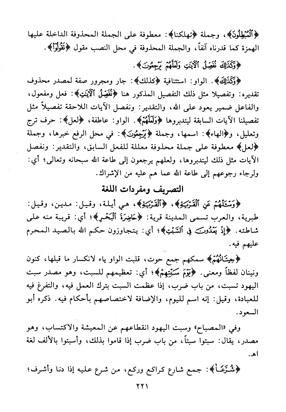 {وَكَذلِكَ}. الواو: استئنافية {كَذلِكَ}: جار ومجرور صفة لمصدر محذوف تقديره: وتفصيلا مثل ذلك التفصيل المذكور هنا {نُفَصِّلُ الْآياتِ}: فعل ومفعول، والفاعل ضمير يعود على الله، والتقدير: ونفصل الآيات اللاحقة تفصيلا مثل تفصيلنا الآيات السابقة ليتدبروها {وَلَعَلَّهُمْ}. الواو: عاطفة، {لعل}: حرف ترج وتعليل، و {الهاء}: اسمها، وجملة {يَرْجِعُونَ}: في محل الرفع خبرها، وجملة {لعل} معطوفة على جملة محذوفة معللة للفعل السابق، والتقدير: ونفصل الآيات مثل ذلك ليتدبروها، ولعلهم يرجعون إلى طاعة الله سبحانه وتعالى؛ أي: ولرجاء رجوعهم إلى طاعة الله عما هم عليه من الإشراك.
