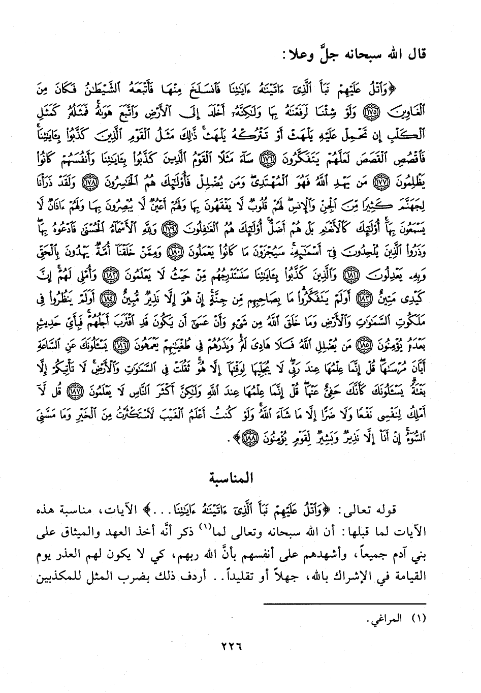 قوله تعالى: {وَاتْلُ عَلَيْهِمْ نَبَأَ الَّذِي آتَيْناهُ آياتِنا ...} الآيات، مناسبة هذه الآيات لما قبلها: أن الله سبحانه وتعالى لما (¬1) ذكر أنّه أخذ العهد والميثاق على بني آدم جميعا، وأشهدهم على أنفسهم بأنّ الله ربهم، كي لا يكون لهم العذر يوم القيامة في الإشراك بالله، جهلا أو تقليدا .. أردف ذلك بضرب المثل للمكذبين