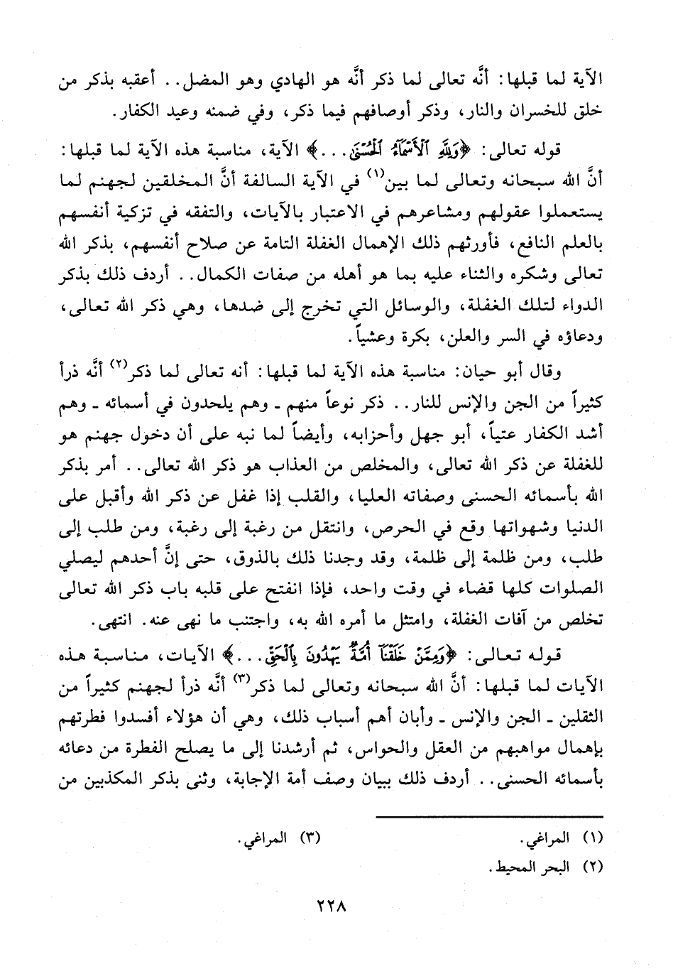 وقال أبو حيان: مناسبة هذه الآية لما قبلها: أنه تعالى لما ذكر (¬2) أنّه ذرأ كثيرا من الجن والإنس للنار .. ذكر نوعا منهم - وهم يلحدون في أسمائه - وهم أشد الكفار عتيا، أبو جهل وأحزابه، وأيضا لما نبه على أن دخول جهنم هو للغفلة عن ذكر الله تعالى، والمخلص من العذاب هو ذكر الله تعالى .. أمر بذكر الله بأسمائه الحسنى وصفاته العليا، والقلب إذا غفل عن ذكر الله وأقبل على الدنيا وشهواتها وقع في الحرص، وانتقل من رغبة إلى رغبة، ومن طلب إلى طلب، ومن ظلمة إلى ظلمة، وقد وجدنا ذلك بالذوق، حتى إنّ أحدهم ليصلي الصلوات كلها قضاء في وقت واحد، فإذا انفتح على قلبه باب ذكر الله تعالى تخلص من آفات الغفلة، وامتثل ما أمره الله به، واجتنب ما نهى عنه. انتهى.