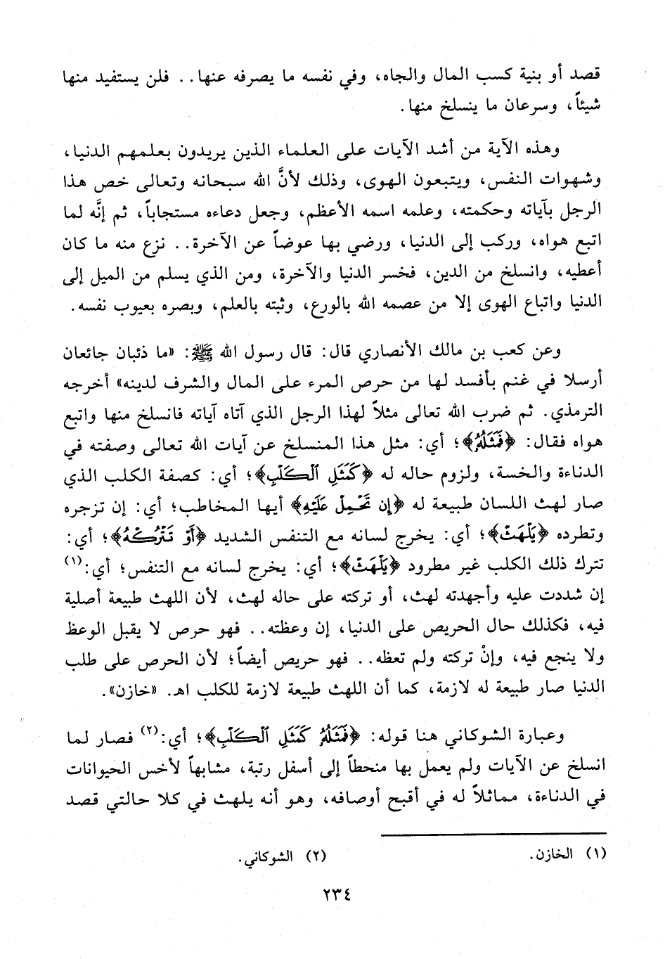 وعبارة الشوكاني هنا قوله: {فَمَثَلُهُ كَمَثَلِ الْكَلْبِ}؛ أي: (¬2) فصار لما انسلخ عن الآيات ولم يعمل بها منحطا إلى أسفل رتبة، مشابها لأخس الحيوانات في الدناءة، مماثلا له في أقبح أوصافه، وهو أنه يلهث في كلا حالتي قصد