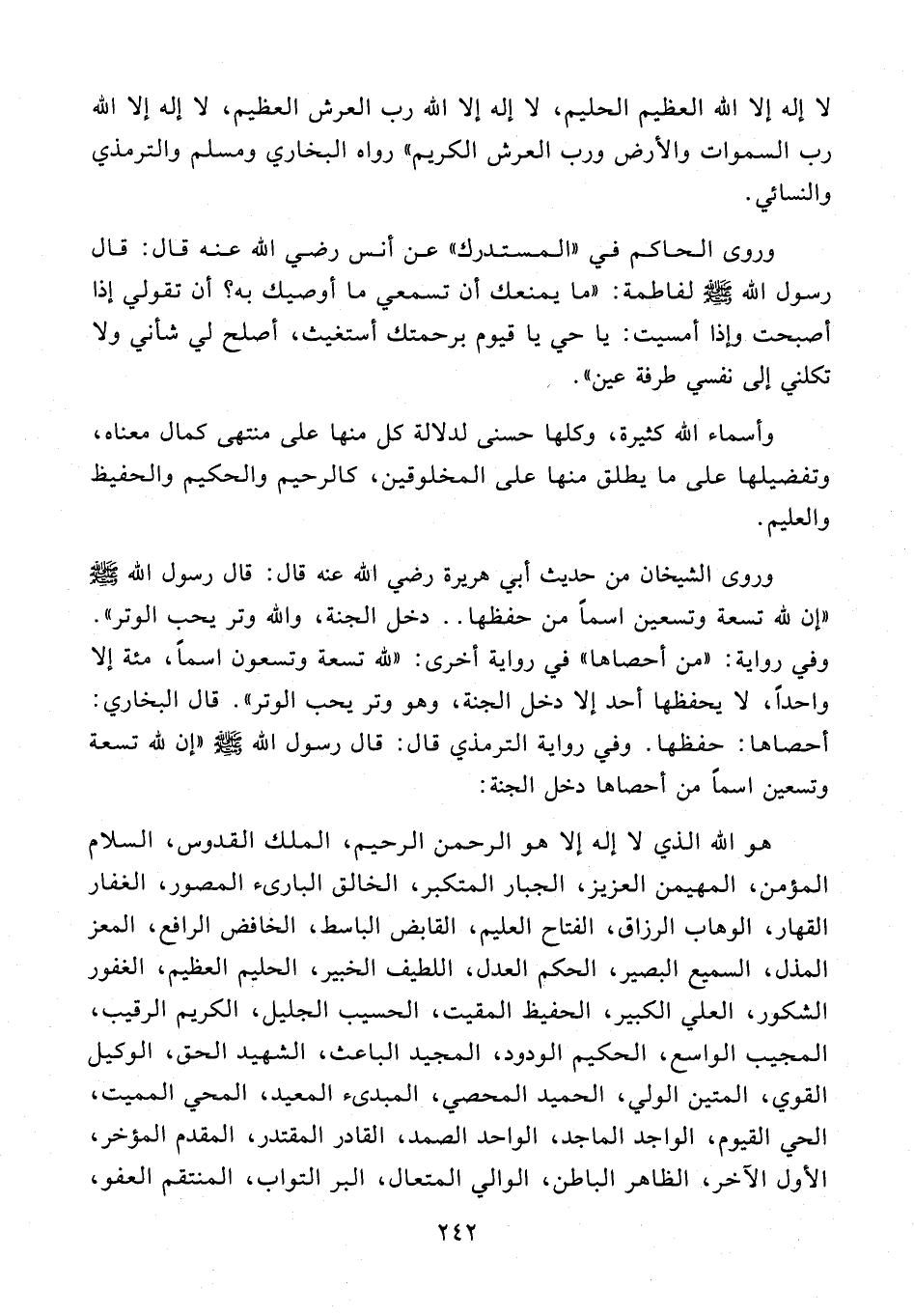 وفي رواية: «من أحصاها» في رواية أخرى: «لله تسعة وتسعون اسما، مئة إلا واحدا، لا يحفظها أحد إلا دخل الجنة، وهو وتر يحب الوتر». قال البخاري: أحصاها: حفظها. وفي رواية الترمذي قال: قال رسول الله صلى الله عليه وسلّم «إن لله تسعة وتسعين اسما من أحصاها دخل الجنة: هو الله الذي لا إله إلا هو الرحمن الرحيم، الملك القدوس، السلام المؤمن، المهيمن العزيز، الجبار المتكبر، الخالق البارىء المصور، الغفار القهار، الوهاب الرزاق، الفتاح العليم، القابض الباسط، الخافض الرافع، المعز المذل، السميع البصير، الحكم العدل، اللطيف الخبير، الحليم العظيم، الغفور الشكور، العلي الكبير، الحفيظ المقيت، الحسيب الجليل، الكريم الرقيب، المجيب الواسع، الحكيم الودود، المجيد الباعث، الشهيد الحق، الوكيل القوي، المتين الولي، الحميد المحصي، المبدىء المعيد، المحي المميت، الحي القيوم، الواجد الماجد، الواحد الصمد، القادر المقتدر، المقدم المؤخر، الأول الآخر، الظاهر الباطن، الوالي المتعال، البر التواب، المنتقم العفو،