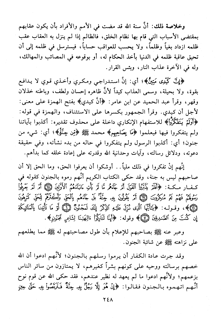 وخلاصة ذلك: أنّ سنة الله قد مضت في الأمم والأفراد بأن يكون عقابهم بمقتضى الأسباب التي قام بها نظام الخلق، فالظالم إذا لم ينزل به العقاب عقب ظلمه ازداد بغيا وظلما، ولا يحسب للعواقب حسابا، فيسترسل في ظلمه إلى أن تحيق عاقبة ظلمه في الدنيا بأخذ الحكام له، أو بوقوعه في المصائب والمهالك، وله في الآخرة عذاب النار، وبئس القرار.