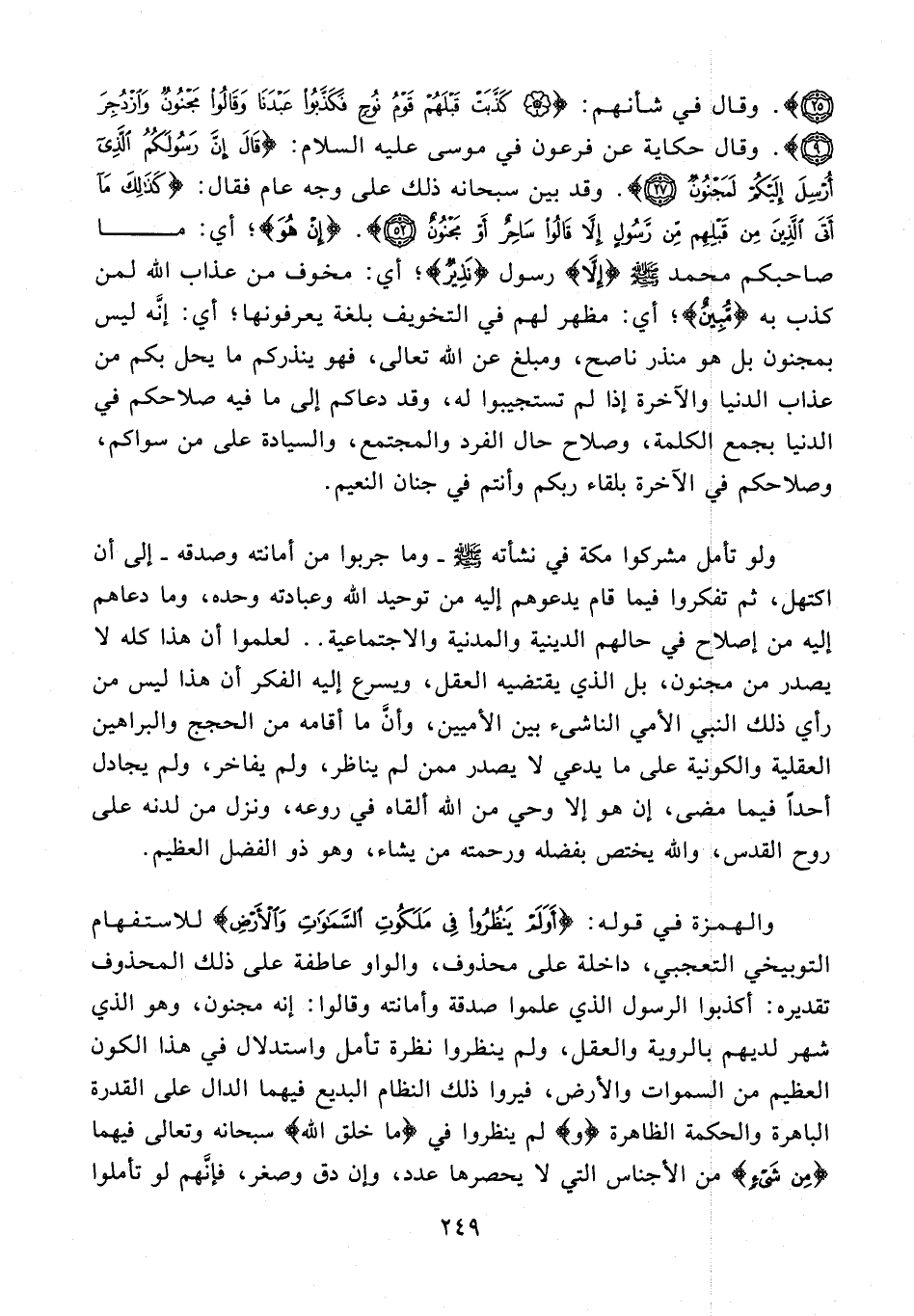 وقال في شأنهم: {كَذَّبَتْ قَبْلَهُمْ قَوْمُ نُوحٍ فَكَذَّبُوا عَبْدَنا وَقالُوا مَجْنُونٌ وَازْدُجِرَ (9)}. وقال حكاية عن فرعون في موسى عليه السلام: {قالَ إِنَّ رَسُولَكُمُ الَّذِي أُرْسِلَ إِلَيْكُمْ لَمَجْنُونٌ (27)}. وقد بين سبحانه ذلك على وجه عام فقال: {كَذلِكَ ما أَتَى الَّذِينَ مِنْ قَبْلِهِمْ مِنْ رَسُولٍ إِلَّا قالُوا ساحِرٌ أَوْ مَجْنُونٌ (52)}. {إِنْ هُوَ}؛ أي: ما صاحبكم محمد صلى الله عليه وسلّم {إِلَّا} رسول {نَذِيرٌ}؛ أي: مخوف من عذاب الله لمن كذب به {مُبِينٌ}؛ أي: مظهر لهم في التخويف بلغة يعرفونها؛ أي: إنّه ليس بمجنون بل هو منذر ناصح، ومبلغ عن الله تعالى، فهو ينذركم ما يحل بكم من عذاب الدنيا والآخرة إذا لم تستجيبوا له، وقد دعاكم إلى ما فيه صلاحكم في الدنيا بجمع الكلمة، وصلاح حال الفرد والمجتمع، والسيادة على من سواكم، وصلاحكم في الآخرة بلقاء ربكم وأنتم في جنان النعيم.
