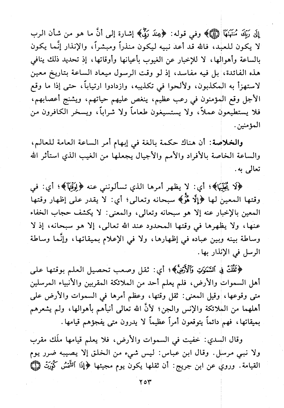 إِلى رَبِّكَ مُنْتَهاها (44)} وفي قوله: {عِنْدَ رَبِّي} إشارة إلى أنّ ما هو من شأن الرب لا يكون للعبد، فالله قد أعد نبيه ليكون منذرا ومبشرا، والإنذار إنّما يكون بالساعة وأهوالها، لا للإخبار عن الغيوب بأعيانها وأوقاتها، إذ تحديد ذلك ينافي هذه الفائدة، بل فيه مفاسد، إذ لو وقت الرسول ميعاد الساعة بتاريخ معين لاستهزأ به المكذبون، ولألحوا في تكذيبه، وازدادوا ارتيابا، حتى إذا ما وقع الأجل وقع المؤمنون في رعب عظيم، ينغص عليهم حياتهم، ويشنج أعصابهم، فلا يستطيعون عملا، ولا يستسيغون طعاما ولا شرابا، ويسخر الكافرون من المؤمنين.