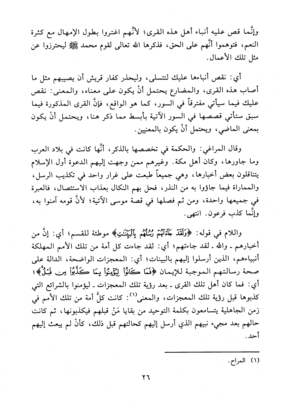 وقال المراغي: والحكمة في تخصصها بالذكر، أنّها كانت في بلاد العرب وما جاورها، وكان أهل مكة. وغيرهم ممن وجهت إليهم الدعوة أول الإسلام يتناقلون بعض أخبارها، وهي جميعا طبعت على غرار واحد في تكذيب الرسل، والمماراة فيما جاؤوا به من النذر، فحل بهم النكال بعذاب الاستئصال، فالعبرة في جميعها واحدة، ومن ثم فصلها في قصة موسى الآتية؛ لأنّ قومه آمنوا به، وإنّما كذب فرعون. انتهى.