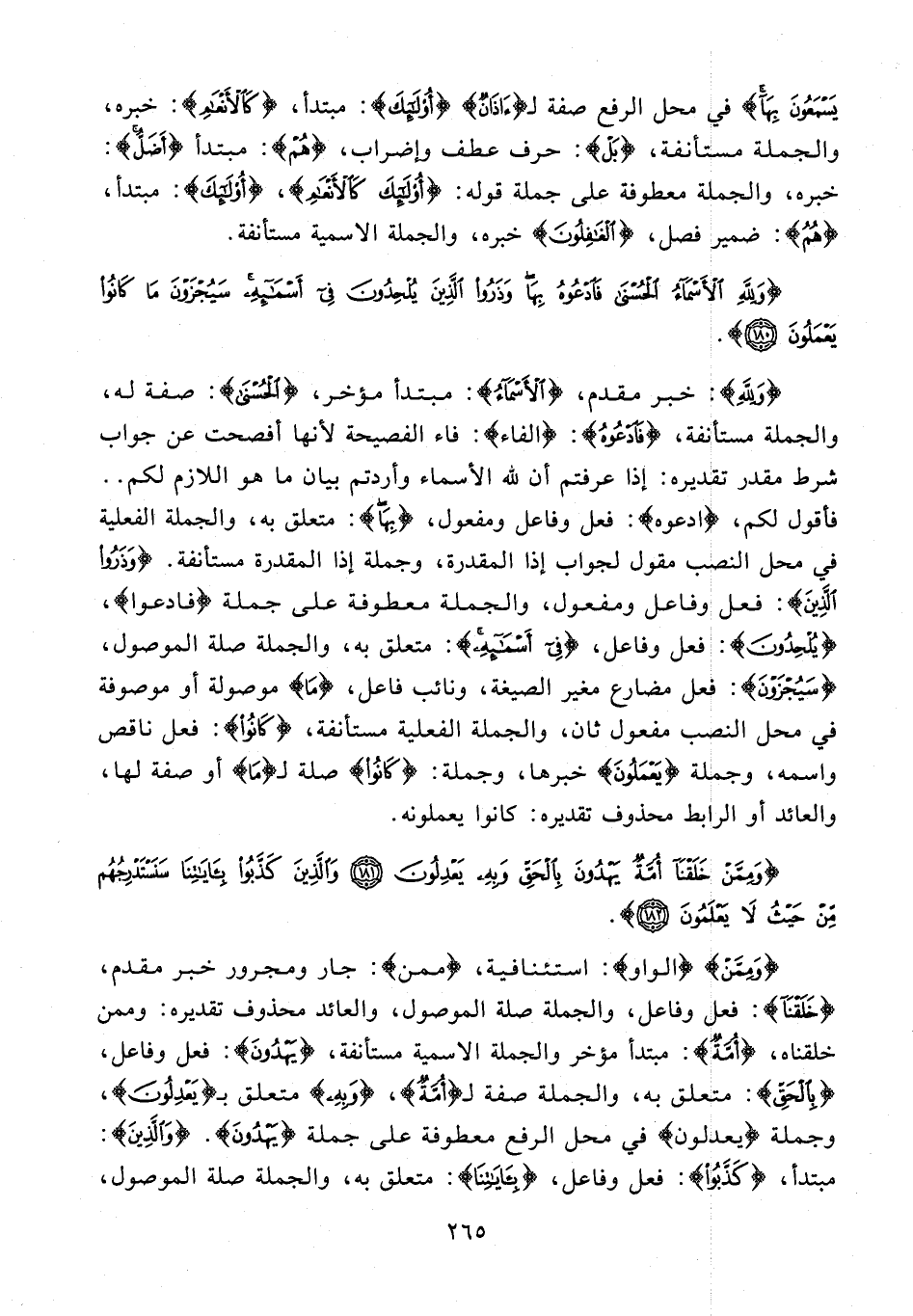 {وَلِلَّهِ}: خبر مقدم، {الْأَسْماءُ}: مبتدأ مؤخر، {الْحُسْنى}: صفة له، والجملة مستأنفة، {فَادْعُوهُ}: {الفاء}: فاء الفصيحة لأنها أفصحت عن جواب شرط مقدر تقديره: إذا عرفتم أن لله الأسماء وأردتم بيان ما هو اللازم لكم .. فأقول لكم، {ادعوه}: فعل وفاعل ومفعول، {بِها}: متعلق به، والجملة الفعلية في محل النصب مقول لجواب إذا المقدرة، وجملة إذا المقدرة مستأنفة. {وَذَرُوا الَّذِينَ}: فعل وفاعل ومفعول، والجملة معطوفة على جملة {فادعوا}، {يُلْحِدُونَ}: فعل وفاعل، {فِي أَسْمائِهِ}: متعلق به، والجملة صلة الموصول، {سَيُجْزَوْنَ}: فعل مضارع مغير الصيغة، ونائب فاعل، {ما} موصولة أو موصوفة في محل النصب مفعول ثان، والجملة الفعلية مستأنفة، {كانُوا}: فعل ناقص واسمه، وجملة {يَعْمَلُونَ} خبرها، وجملة: {كانُوا} صلة لـ {ما} أو صفة لها، والعائد أو الرابط محذوف تقديره: كانوا يعملونه.