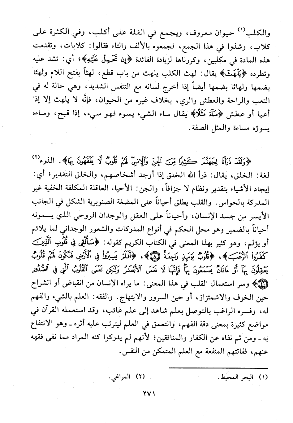 {وَلَقَدْ ذَرَأْنا لِجَهَنَّمَ كَثِيرًا مِنَ الْجِنِّ وَالْإِنْسِ لَهُمْ قُلُوبٌ لا يَفْقَهُونَ بِها}. الذرء (¬2) لغة: الخلق، يقال: ذرأ الله الخلق إذا أوجد أشخاصهم، والخلق التقدير؛ أي: إيجاد الأشياء بتقدير ونظام لا جزافا، والجن: الأحياء العاقلة المكلفة الخفية غير المدركة بالحواس. والقلب يطلق أحيانا على المضغة الصنوبرية الشكل في الجانب الأيسر من جسد الإنسان، وأحيانا على العقل والوجدان الروحي الذي يسمونه أحيانا بالضمير وهو محل الحكم في أنواع المدركات والشعور الوجداني لما يلائم أو يؤلم، وهو كثير بهذا المعنى في الكتاب الكريم كقوله: {سَأُلْقِي فِي قُلُوبِ الَّذِينَ كَفَرُوا الرُّعْبَ}، {قُلُوبٌ يَوْمَئِذٍ واجِفَةٌ (8)}، {أَفَلَمْ يَسِيرُوا فِي الْأَرْضِ فَتَكُونَ لَهُمْ قُلُوبٌ يَعْقِلُونَ بِها أَوْ آذانٌ يَسْمَعُونَ بِها فَإِنَّها لا تَعْمَى الْأَبْصارُ وَلكِنْ تَعْمَى الْقُلُوبُ الَّتِي فِي الصُّدُورِ (46)} وسر استعمال القلب في هذا المعنى: ما يراه الإنسان من انقباض أو انشراح حين الخوف والاشمئزاز، أو حين السرور والابتهاج. والفقه: العلم بالشيء والفهم له، وفسره الراغب بالتوصل بعلم شاهد إلى علم غائب، وقد استعمله القرآن في مواضع كثيرة بمعنى دقة الفهم، والتعمق في العلم ليترتب عليه أثره - وهو الانتفاع به - ومن ثم نفاه عن الكفار والمنافقين؛ لأنهم لم يدركوا كنه المراد مما نفى فقهه عنهم، ففاتتهم المنفعة مع العلم المتمكن من النفس.