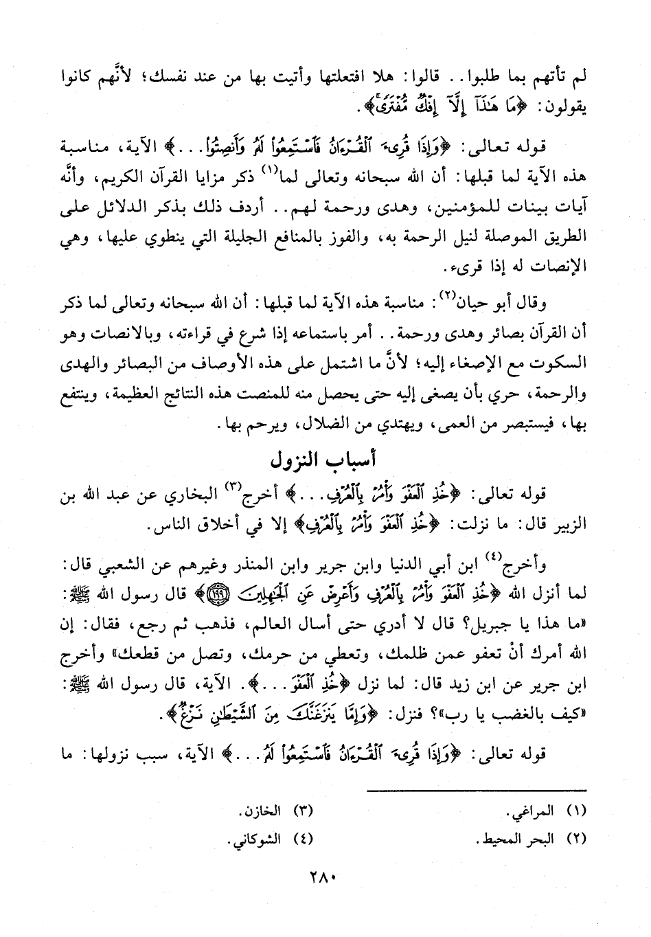 قوله تعالى: {خُذِ الْعَفْوَ وَأْمُرْ بِالْعُرْفِ ...} أخرج (¬3) البخاري عن عبد الله بن الزبير قال: ما نزلت: {خُذِ الْعَفْوَ وَأْمُرْ بِالْعُرْفِ} إلا في أخلاق الناس.