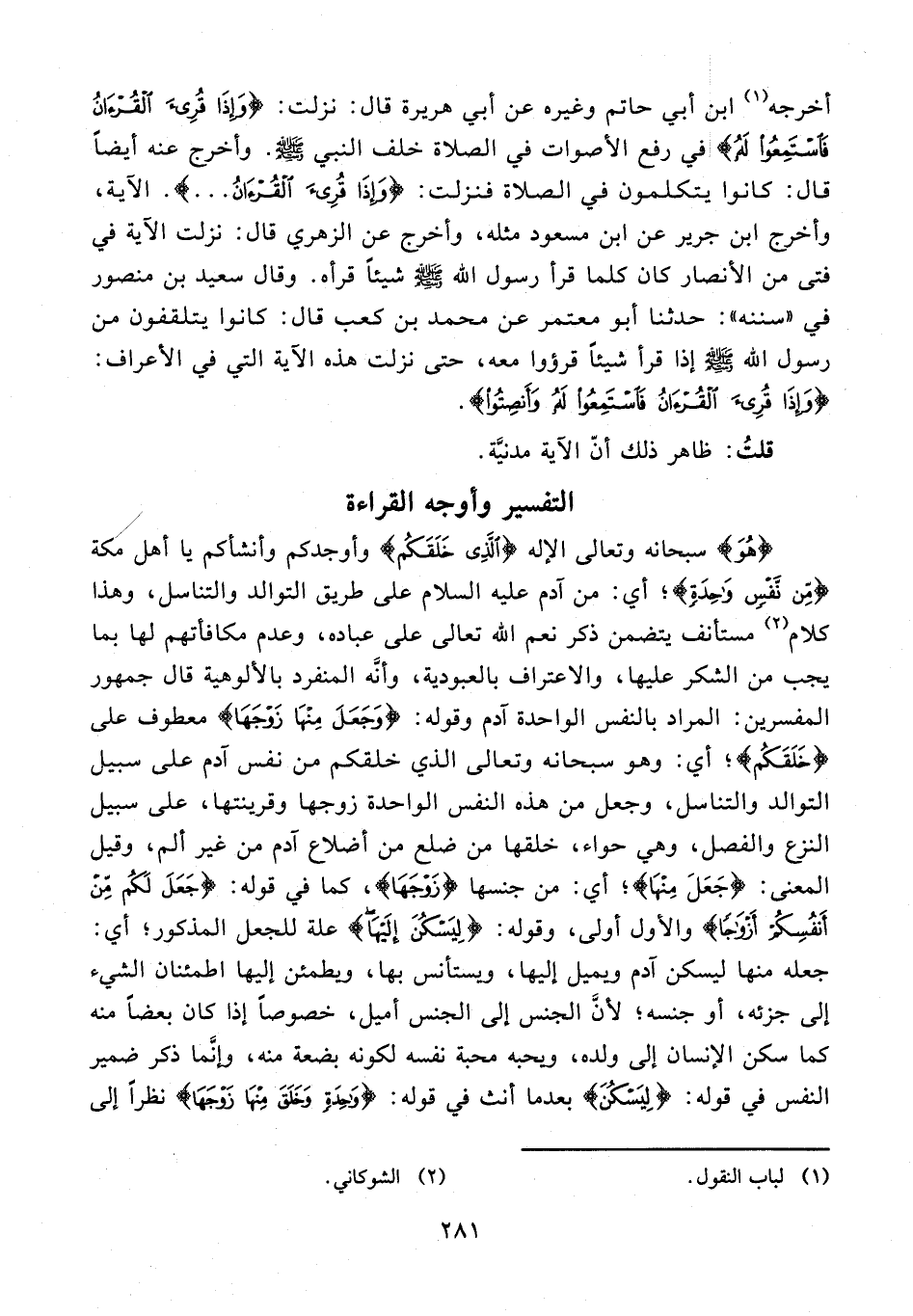 189 - {هُوَ} سبحانه وتعالى الإله {الَّذِي خَلَقَكُمْ} وأوجدكم وأنشأكم يا أهل مكة {مِنْ نَفْسٍ واحِدَةٍ}؛ أي: من آدم عليه السلام على طريق التوالد والتناسل، وهذا كلام (¬2) مستأنف يتضمن ذكر نعم الله تعالى على عباده، وعدم مكافأتهم لها بما يجب من الشكر عليها، والاعتراف بالعبودية، وأنّه المنفرد بالألوهية قال جمهور المفسرين: المراد بالنفس الواحدة آدم وقوله: {وَجَعَلَ مِنْها زَوْجَها} معطوف على {خَلَقَكُمْ}؛ أي: وهو سبحانه وتعالى الذي خلقكم من نفس آدم على سبيل التوالد والتناسل، وجعل من هذه النفس الواحدة زوجها وقرينتها، على سبيل النزع والفصل، وهي حواء، خلقها من ضلع من أضلاع آدم من غير ألم، وقيل المعنى: {جَعَلَ مِنْها}؛ أي: من جنسها {زَوْجَها}، كما في قوله: {جَعَلَ لَكُمْ مِنْ أَنْفُسِكُمْ أَزْواجًا} والأول أولى، وقوله: {لِيَسْكُنَ إِلَيْها} علة للجعل المذكور؛ أي: جعله منها ليسكن آدم ويميل إليها، ويستأنس بها، ويطمئن إليها اطمئنان الشيء إلى جزئه، أو جنسه؛ لأنّ الجنس إلى الجنس أميل، خصوصا إذا كان بعضا منه كما سكن الإنسان إلى ولده، ويحبه محبة نفسه لكونه بضعة منه، وإنّما ذكر ضمير النفس في قوله: {لِيَسْكُنَ} بعد ما أنث في قوله: {واحِدَةٍ وَخَلَقَ مِنْها زَوْجَها} نظرا إلى