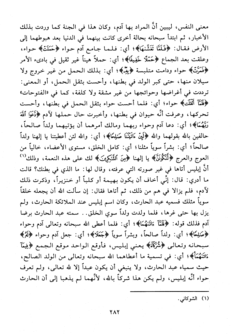 190 - {فَلَمَّا آتاهُما}؛ أي: فلما أعطى الله سبحانه وتعالى آدم وحواء {صالِحًا}؛ أي: ولدا صالحا، وبشرا سويا {جَعَلا}؛ أي: جعل آدم وحواء {لَهُ} سبحانه وتعالى {شُرَكاءَ} يعني إبليس، فأوقع الواحد موقع الجمع {فِيما آتاهُما}؛ أي: في تسمية ما أعطاهما الله سبحانه وتعالى من الولد الصالح، حيث سمياه عبد الحارث، ولا ينبغي أن يكون عبدا إلا لله تعالى، ولم تعرف حواء أنّه إبليس، ولم يكن هذا شركا بالله، لأنّهما لم يذهبا إلى أن الحارث