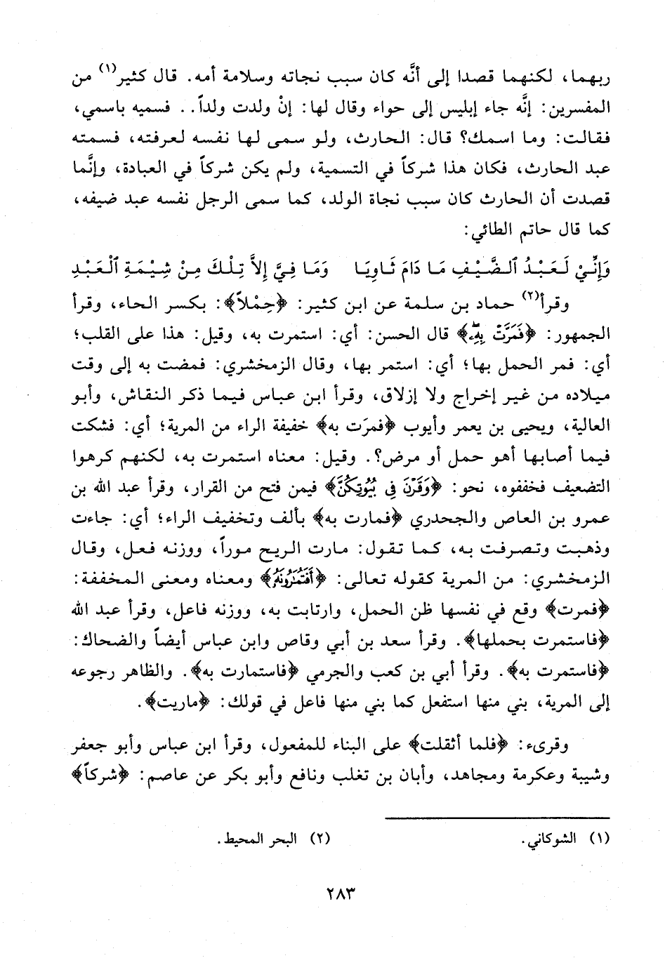 ربهما، لكنهما قصدا إلى أنّه كان سبب نجاته وسلامة أمه. قال كثير (¬1) من المفسرين: إنّه جاء إبليس إلى حواء وقال لها: إن ولدت ولدا .. فسميه باسمي، فقالت: وما اسمك؟ قال: الحارث، ولو سمى لها نفسه لعرفته، فسمته عبد الحارث، فكان هذا شركا في التسمية، ولم يكن شركا في العبادة، وإنّما قصدت أن الحارث كان سبب نجاة الولد، كما سمى الرجل نفسه عبد ضيفه، كما قال حاتم الطائي: