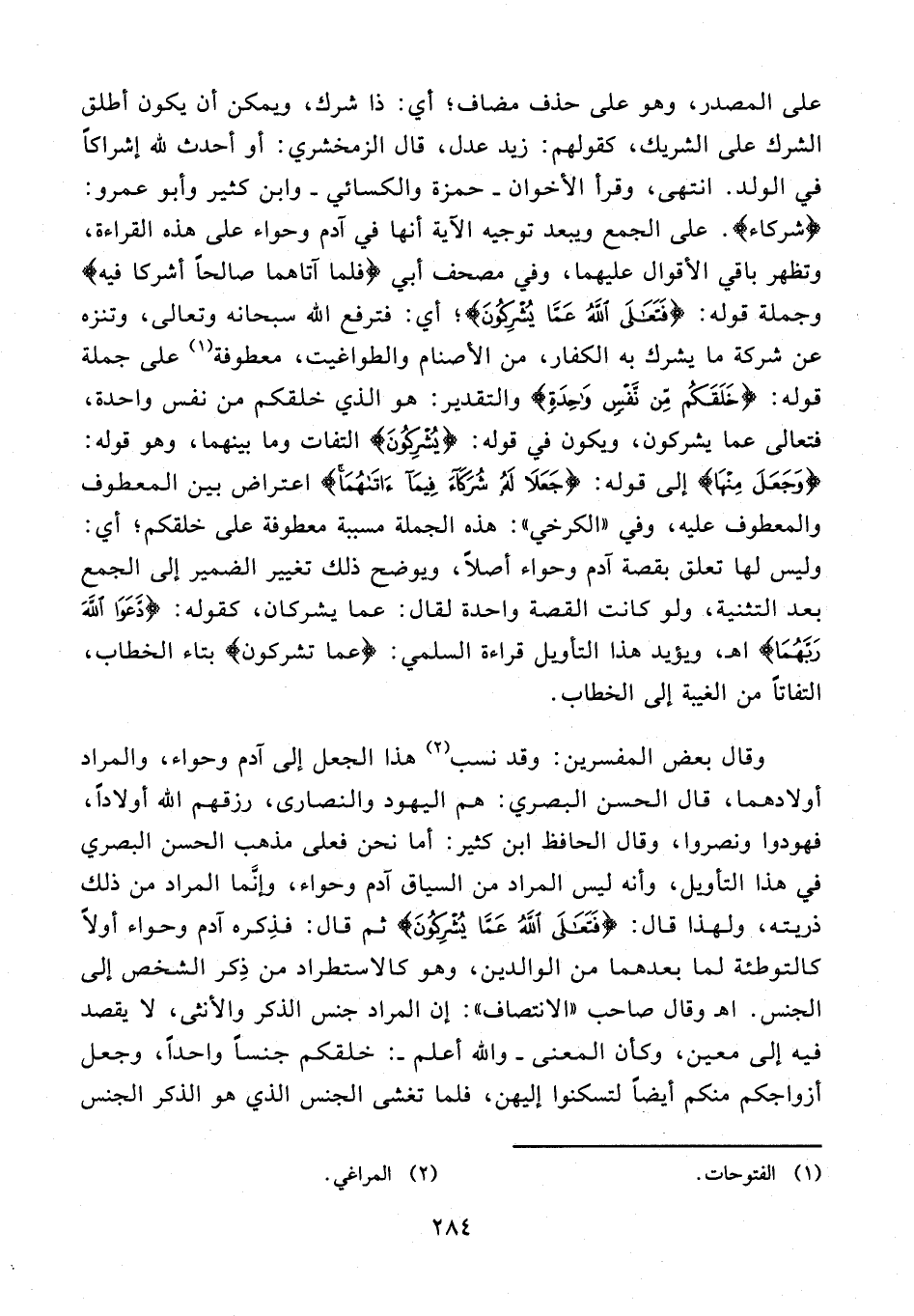 وقال بعض المفسرين: وقد نسب (¬2) هذا الجعل إلى آدم وحواء، والمراد أولادهما، قال الحسن البصري: هم اليهود والنصارى، رزقهم الله أولادا، فهودوا ونصروا، وقال الحافظ ابن كثير: أما نحن فعلى مذهب الحسن البصري في هذا التأويل، وأنه ليس المراد من السياق آدم وحواء، وإنّما المراد من ذلك ذريته، ولهذا قال: {فَتَعالَى اللَّهُ عَمَّا يُشْرِكُونَ} ثم قال: فذكره آدم وحواء أولا كالتوطئة لما بعدهما من الوالدين، وهو كالاستطراد من ذكر الشخص إلى الجنس. اه وقال صاحب «الانتصاف»: إن المراد جنس الذكر والأنثى، لا يقصد فيه إلى معين، وكأن المعنى - والله أعلم -: خلقكم جنسا واحدا، وجعل أزواجكم منكم أيضا لتسكنوا إليهن، فلما تغشى الجنس الذي هو الذكر الجنس