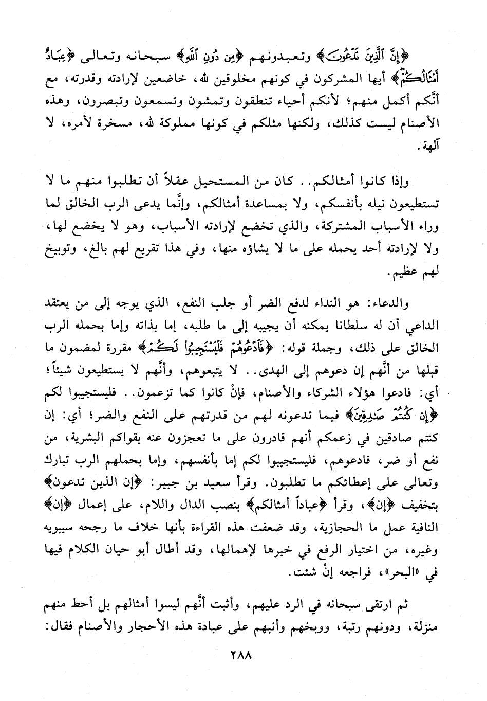 194 - {إِنَّ الَّذِينَ تَدْعُونَ} وتعبدونهم {مِنْ دُونِ اللَّهِ} سبحانه وتعالى {عِبادٌ أَمْثالُكُمْ} أيها المشركون في كونهم مخلوقين لله، خاضعين لإرادته وقدرته، مع أنّكم أكمل منهم؛ لأنكم أحياء تنطقون وتمشون وتسمعون وتبصرون، وهذه الأصنام ليست كذلك، ولكنها مثلكم في كونها مملوكة لله، مسخرة لأمره، لا آلهة.
