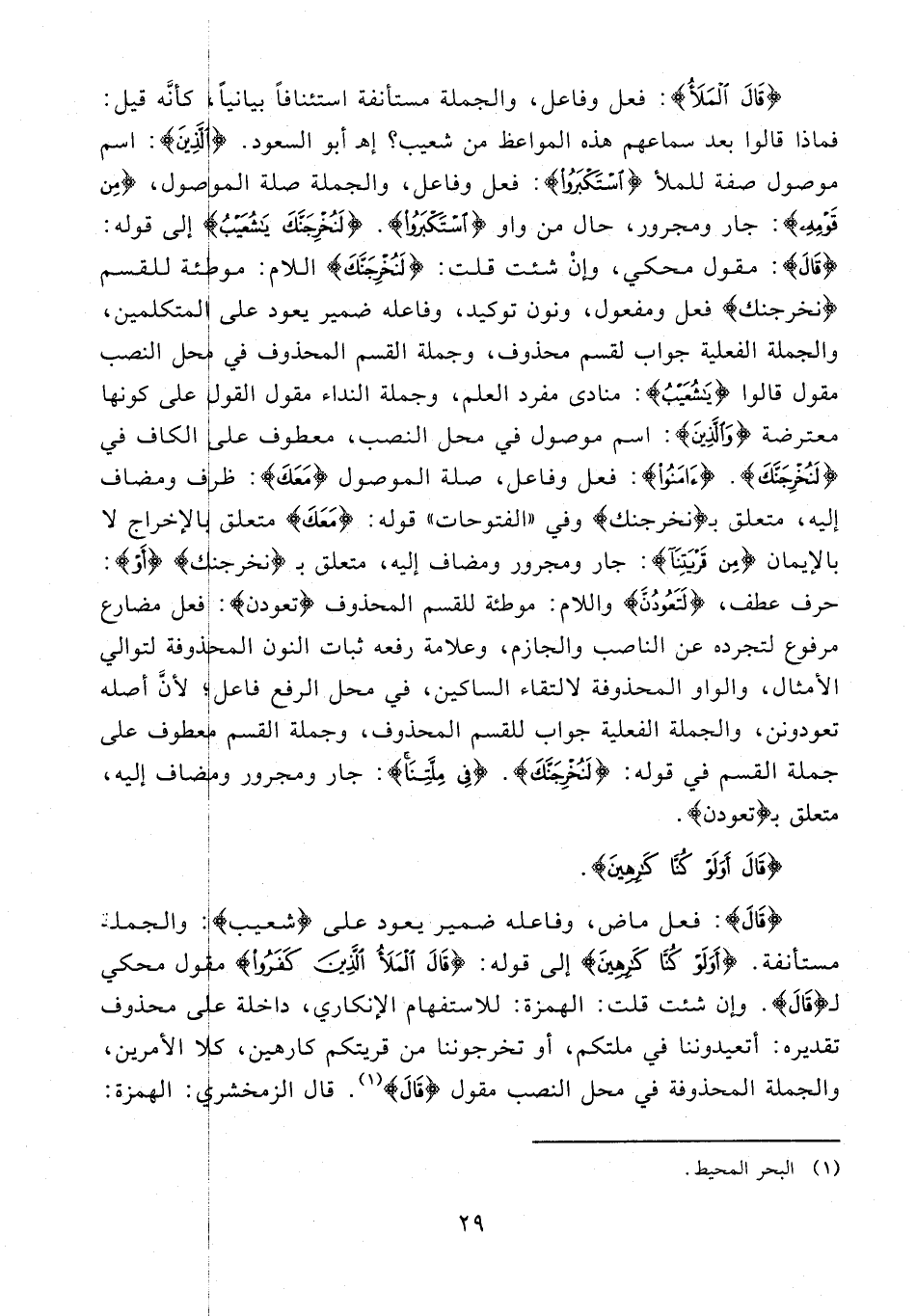 {قالَ}: فعل ماض، وفاعله ضمير يعود على {شُعَيْبُ}: والجملة مستأنفة. {أَوَلَوْ كُنَّا كارِهِينَ} إلى قوله: {قالَ الْمَلَأُ الَّذِينَ كَفَرُوا} مقول محكي لـ {قالَ}. وإن شئت قلت: الهمزة: للاستفهام الإنكاري، داخلة على محذوف تقديره: أتعيدوننا في ملتكم، أو تخرجوننا من قريتكم كارهين، كلا الأمرين، والجملة المحذوفة في محل النصب مقول {قالَ} (¬1). قال الزمخشري: الهمزة: