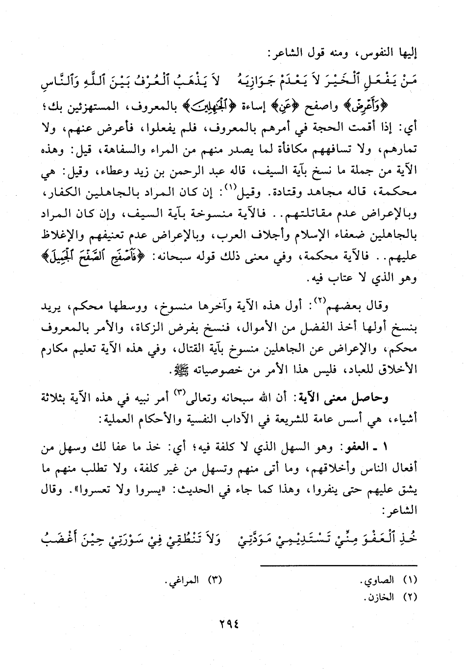 وحاصل معنى الآية: أن الله سبحانه وتعالى (¬3) أمر نبيه في هذه الآية بثلاثة أشياء، هي أسس عامة للشريعة في الآداب النفسية والأحكام العملية: