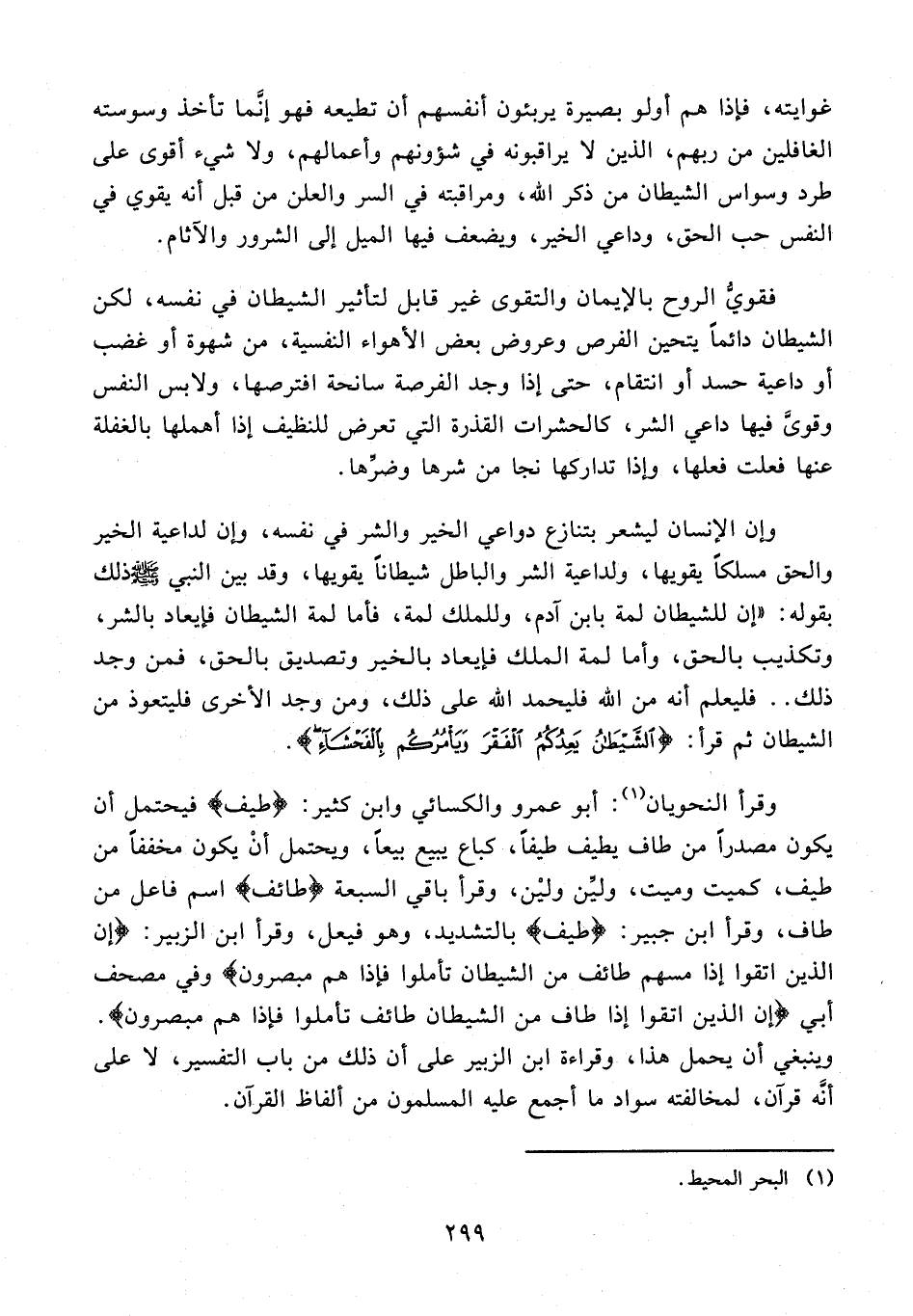 فقويّ الروح بالإيمان والتقوى غير قابل لتأثير الشيطان في نفسه، لكن الشيطان دائما يتحين الفرص وعروض بعض الأهواء النفسية، من شهوة أو غضب أو داعية حسد أو انتقام، حتى إذا وجد الفرصة سانحة افترصها، ولا بس النفس وقوىّ فيها داعي الشر، كالحشرات القذرة التي تعرض للنظيف إذا أهملها بالغفلة عنها فعلت فعلها، وإذا تداركها نجا من شرها وضرّها.