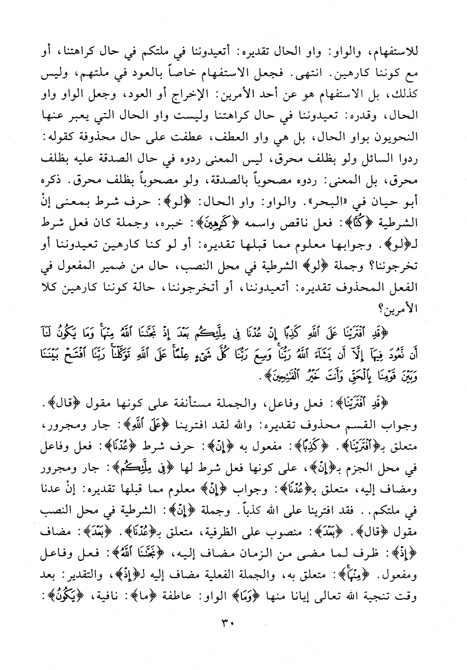 {قَدِ افْتَرَيْنا}: فعل وفاعل، والجملة مستأنفة على كونها مقول {قالَ}. وجواب القسم محذوف تقديره: والله لقد افترينا {عَلَى اللَّهِ}: جار ومجرور، متعلق بـ {افْتَرَيْنا}. {كَذِبًا}: مفعول به {إِنْ}: حرف شرط {عُدْنا}: فعل وفاعل في محل الجزم بـ {إِنْ}، على كونها فعل شرط لها فِي {مِلَّتِكُمْ}: جار ومجرور ومضاف إليه، متعلق بـ {عُدْنا}: وجواب {إِنْ} معلوم مما قبلها تقديره: إن عدنا في ملتكم .. فقد افترينا على الله كذبا. وجملة {إِنْ}: الشرطية في محل النصب مقول {قالَ}. {بَعْدَ}: منصوب على الظرفية، متعلق بـ {عُدْنا}. {بَعْدَ}: مضاف {إِذْ}: ظرف لما مضى من الزمان مضاف إليه، {نَجَّانَا اللَّهُ}: فعل وفاعل ومفعول. {مِنْها}: متعلق به، والجملة الفعلية مضاف إليه لـ {إِذْ}، والتقدير: بعد وقت تنجية الله تعالى إيانا منها {وَما} الواو: عاطفة ما: نافية، {يَكُونُ}: