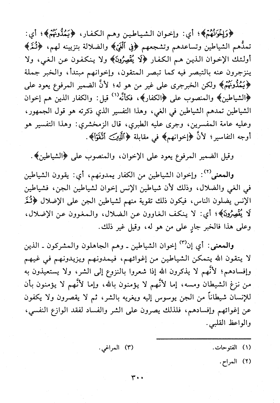 202 - {وَإِخْوانُهُمْ}؛ أي: وإخوان الشياطين وهم الكفار، {يَمُدُّونَهُمْ}؛ أي: تمدّهم الشياطين وتساعدهم وتشجعهم {فِي الغَيِّ} والضلالة بتزيينه لهم، {ثُمَّ} أولئك الإخوان الذين هم الكفار {لا يُقْصِرُونَ} ولا ينكفون عن الغي، ولا ينزجرون عنه بالتبصر فيه كما تبصر المتقون، وإخوانهم مبتدأ، والخبر جملة {يَمُدُّونَهُمْ} ولكن الخبرجرى على غير من هو له؛ لأنّ الضمير المرفوع يعود على {الشياطين} والمنصوب على {الكفار}، فكأنّه (¬1) قيل: والكفار الذين هم إخوان الشياطين تمدهم الشياطين في الغي، وهذا التفسير الذي ذكرته هو قول الجمهور، وعليه عامة المفسرين، وجرى عليه الطبري، قال الزمخشري: وهذا التفسير هو أوجه التفاسير؛ لأنّ {إِخْوانُهُمْ} في مقابلة {الَّذِينَ اتَّقَوْا}.