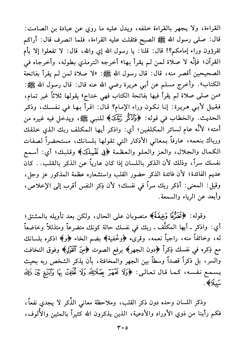 205 - والخطاب في قوله: {وَاذْكُرْ رَبَّكَ} للنبي صلى الله عليه وسلّم، ويدخل فيه غيره من أمته؛ لأنّه عام لسائر المكلفين؛ أي: واذكر أيها المكلف ربك الذي خلقك ورباك بنعمه، عارفا بمعاني الأذكار التي تقولها بلسانك، مستحضرا لصفات الكمال والجلال، والعز والعلو والعظمة {فِي نَفْسِكَ} وقلبك؛ أي: أسمع نفسك سرا، وذلك لأن الذكر باللسان إذا كان عاريا عن الذكر بالقلب .. كان عديم الفائدة؛ لأن فائدة الذكر حضور القلب واستشعاره عظمة المذكور عز وجل، وقيل: المعنى: أذكر ربك سرا في نفسك؛ لأن ذكر النفس أقرب إلى الإخلاص، وأبعد عن الرياء والسمعة.
