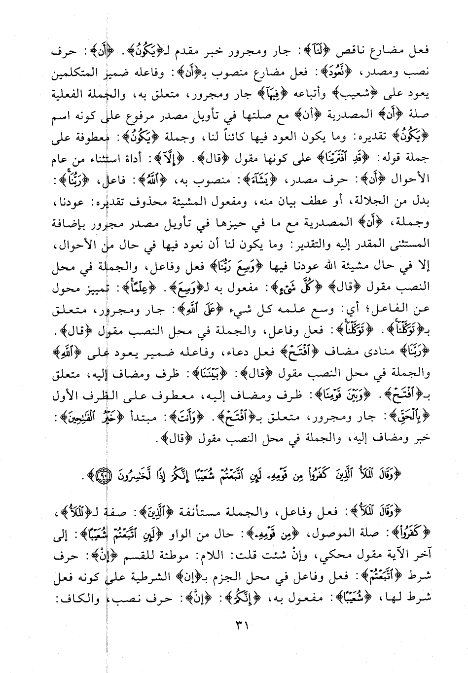 فعل مضارع ناقص {لَنا}: جار ومجرور خبر مقدم لـ {يَكُونُ}. {إِنْ}: حرف نصب ومصدر، {نَعُودَ}: فعل مضارع منصوب بـ {إِنْ}: وفاعله ضمير المتكلمين يعود على {شُعَيْبُ} وأتباعه {فِيها} جار ومجرور، متعلق به، والجملة الفعلية صلة {أنْ} المصدرية {أنْ} مع صلتها في تأويل مصدر مرفوع على كونه اسم {يَكُونُ} تقديره: وما يكون العود فيها كائنا لنا، وجملة {يَكُونُ}: معطوفة على جملة قوله: {قَدِ افْتَرَيْنا} على كونها مقول {قالَ}. {إِلَّا}: أداة استثناء من عام الأحوال {أنْ}: حرف مصدر، {يَشاءَ}: منصوب به، {اللَّهِ}: فاعل، {رَبُّنا}: بدل من الجلالة، أو عطف بيان منه، ومفعول المشيئة محذوف تقديره: عودنا، وجملة، {أنْ} المصدرية مع ما في حيزها في تأويل مصدر مجرور بإضافة المستثنى المقدر إليه والتقدير: وما يكون لنا أن نعود فيها في حال من الأحوال، إلا في حال مشيئة الله عودنا فيها {وَسِعَ رَبُّنا} فعل وفاعل، والجملة في محل النصب مقول {قالَ} {كُلَّ شَيْءٍ}: مفعول به لـ {وَسِعَ}. {عِلْمًا}: تمييز محول عن الفاعل؛ أي: وسع علمه كل شيء {عَلَى اللَّهِ}: جار ومجرور، متعلق بـ {تَوَكَّلْنا}. {تَوَكَّلْنا}: فعل وفاعل، والجملة في محل النصب مقول {قالَ}. {رَبُّنا} منادى مضاف {افْتَحْ} فعل دعاء، وفاعله ضمير يعود على {اللَّهِ} والجملة في محل النصب مقول {قالَ}: {بَيْنَنا}: ظرف ومضاف إليه، متعلق بـ {افْتَحْ}. {وَبَيْنَ قَوْمِنا}: ظرف ومضاف إليه، معطوف على الظرف الأول {بِالْحَقِّ}: جار ومجرور، متعلق بـ {افْتَحْ}. {وَأَنْتَ}: مبتدأ {خَيْرُ الْفاتِحِينَ}: خبر ومضاف إليه، والجملة في محل النصب مقول {قالَ}.