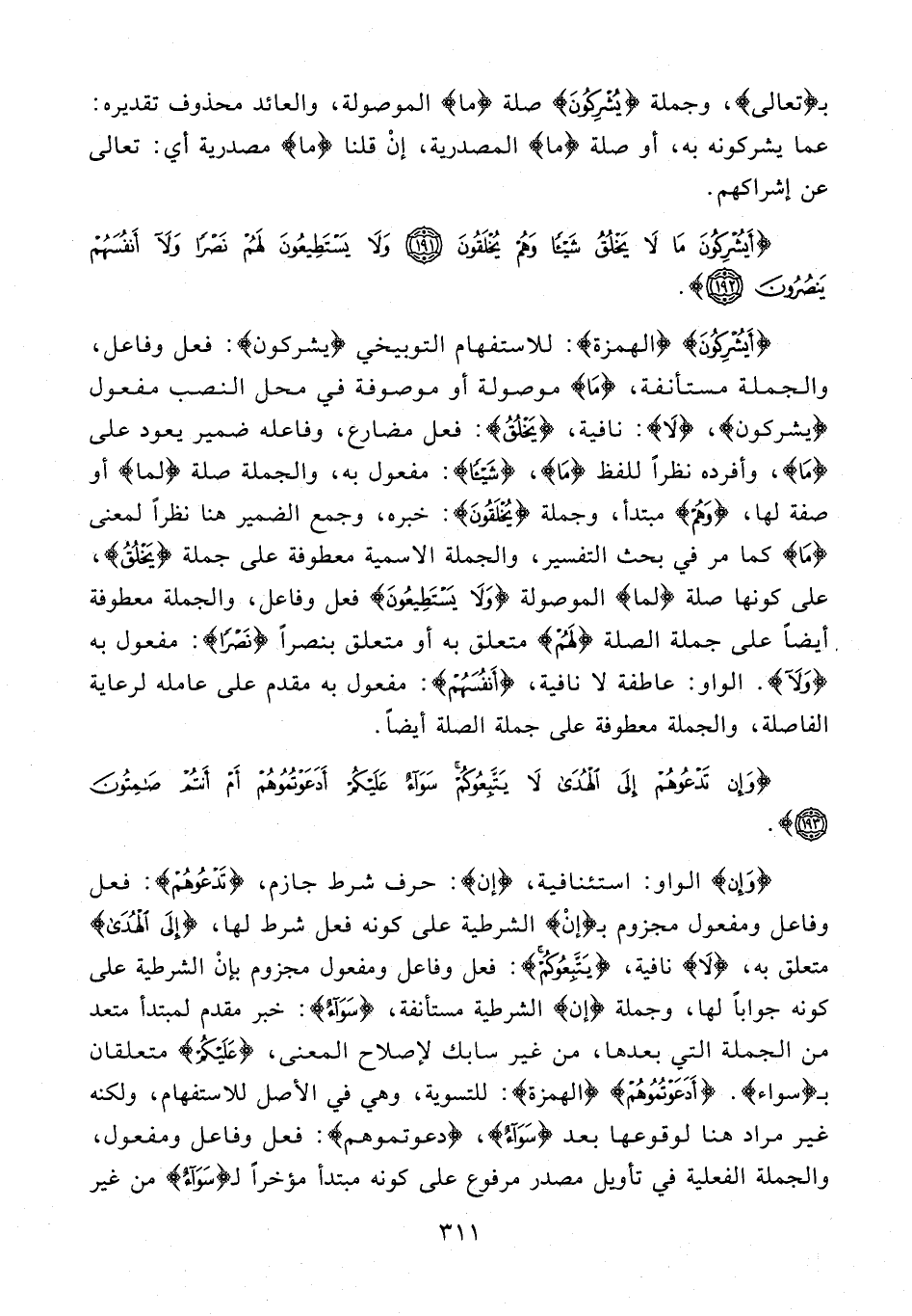 {أَيُشْرِكُونَ} {الهمزة}: للاستفهام التوبيخي {يُشْرِكُونَ}: فعل وفاعل، والجملة مستأنفة، ما موصولة أو موصوفة في محل النصب مفعول {يُشْرِكُونَ}، {لا}: نافية، {يَخْلُقُ}: فعل مضارع، وفاعله ضمير يعود على ما، وأفرده نظرا للفظ ما، {شَيْئًا}: مفعول به، والجملة صلة {لما} أو صفة لها، {وَهُمْ} مبتدأ، وجملة {يُخْلَقُونَ}: خبره، وجمع الضمير هنا نظرا لمعنى ما كما مر في بحث التفسير، والجملة الاسمية معطوفة على جملة {يَخْلُقُ}، على كونها صلة {لما} الموصولة {وَلا يَسْتَطِيعُونَ} فعل وفاعل، والجملة معطوفة أيضا على جملة الصلة {لَهُمْ} متعلق به أو متعلق بنصرا {نَصْرًا}: مفعول به {وَلا}. الواو: عاطفة {لا} نافية، {أَنْفُسَهُمْ}: مفعول به مقدم على عامله لرعاية الفاصلة، والجملة معطوفة على جملة الصلة أيضا.