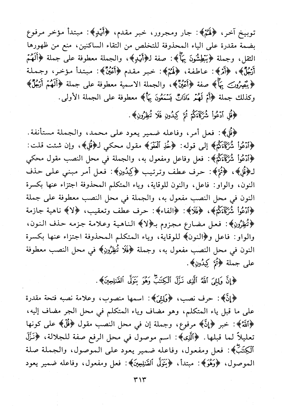 {ادْعُوا شُرَكاءَكُمْ} إلى قوله: {خُذِ الْعَفْوَ} مقول محكي لـ {قُلِ}، وإن شئت قلت: {ادْعُوا شُرَكاءَكُمْ}: فعل وفاعل ومفعول به، والجملة في محل النصب مقول محكي لـ {قُلِ}، {ثُمَّ}: حرف عطف وترتيب {كِيدُونِ}: فعل أمر مبني على حذف النون، والواو: فاعل، والنون للوقاية، وياء المتكلم المحذوفة اجتزاء عنها بكسرة النون في محل النصب مفعول به، والجملة في محل النصب معطوفة على جملة {ادْعُوا شُرَكاءَكُمْ}، {فَلا}: {الفاء}: حرف عطف وتعقيب، {لا} ناهية جازمة {تُنْظِرُونِ}: فعل مضارع مجزوم بـ {لا} الناهية وعلامة جزمه حذف النون، والواو: فاعل و {النون} للوقاية، وياء المتكلم المحذوفة اجتزاء عنها بكسرة النون في محل النصب مفعول به، وجملة {فَلا تُنْظِرُونِ} في محل النصب معطوفة على جملة {ثُمَّ كِيدُونِ}.
