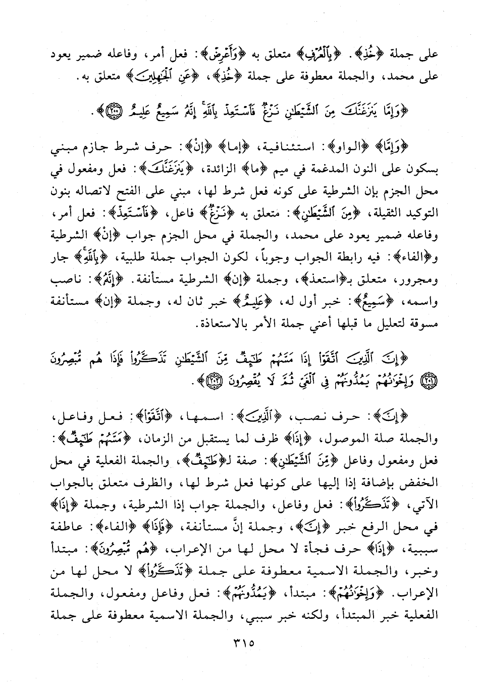 {إِنَّ}: حرف نصب، {الَّذِينَ}: اسمها، {اتَّقَوْا}: فعل وفاعل، والجملة صلة الموصول، إِذا ظرف لما يستقبل من الزمان، {مَسَّهُمْ طائِفٌ}: فعل ومفعول وفاعل {مِنَ الشَّيْطانِ}: صفة لـ {طائِفٌ}، والجملة الفعلية في محل الخفض بإضافة إذا إليها على كونها فعل شرط لها، والظرف متعلق بالجواب الآتي، {تَذَكَّرُوا}: فعل وفاعل، والجملة جواب إذا الشرطية، وجملة {إِذا} في محل الرفع خبر {إِنَّ}، وجملة إنّ مستأنفة، {فَإِذا} {الفاء}: عاطفة سببية، {إذا} حرف فجأة لا محل لها من الإعراب، {هُمْ مُبْصِرُونَ}: مبتدأ وخبر، والجملة الاسمية معطوفة على جملة {تَذَكَّرُوا} لا محل لها من الإعراب. {وَإِخْوانُهُمْ}: مبتدأ، {يَمُدُّونَهُمْ}: فعل وفاعل ومفعول، والجملة الفعلية خبر المبتدأ، ولكنه خبر سببي، والجملة الاسمية معطوفة على جملة