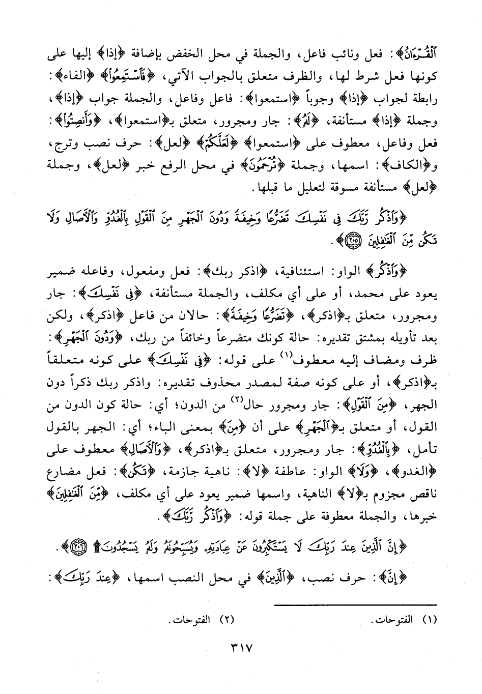 {وَاذْكُرْ} الواو: استئنافية، {اذْكُرْ رَبَّكَ}: فعل ومفعول، وفاعله ضمير يعود على محمد، أو على أي مكلف، والجملة مستأنفة، {فِي نَفْسِكَ}: جار ومجرور، متعلق بـ {اذْكُرْ}، {تَضَرُّعًا وَخِيفَةً}: حالان من فاعل {اذْكُرْ}، ولكن بعد تأويله بمشتق تقديره: حالة كونك متضرعا وخائفا من ربك، {وَدُونَ الْجَهْرِ}: ظرف ومضاف إليه معطوف (¬1) على قوله: {فِي نَفْسِكَ} على كونه متعلقا بـ {اذْكُرْ}، أو على كونه صفة لمصدر محذوف تقديره: واذكر ربك ذكرا دون الجهر، {مِنَ الْقَوْلِ}: جار ومجرور حال (¬2) من الدون؛ أي: حالة كون الدون من القول، أو متعلق بـ {الْجَهْرِ} على أن {مِنَ} بمعنى الباء؛ أي: الجهر بالقول تأمل، {بِالْغُدُوِّ}: جار ومجرور، متعلق بـ {اذْكُرْ}، {وَالْآصالِ} معطوف على {الغدو}، {وَلا} الواو: عاطفة {لا}: ناهية جازمة، {تَكُنْ}: فعل مضارع ناقص مجزوم بـ {لا} الناهية، واسمها ضمير يعود على أي مكلف، {مِنَ الْغافِلِينَ} خبرها، والجملة معطوفة على جملة قوله: {وَاذْكُرْ رَبَّكَ}.