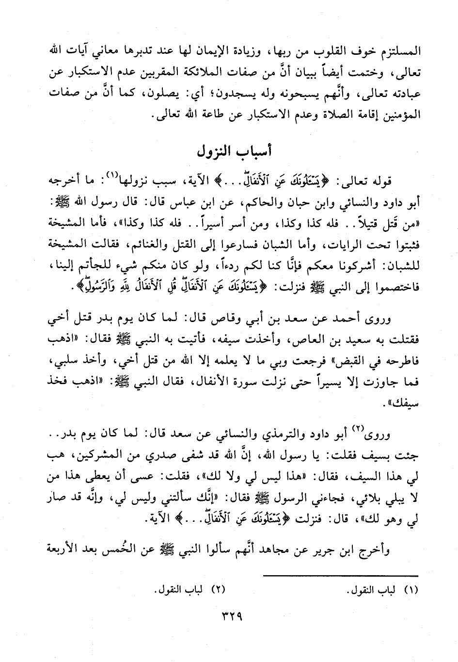 وروى (¬2) أبو داود والترمذي والنسائي عن سعد قال: لما كان يوم بدر .. جئت بسيف فقلت: يا رسول الله، إنّ الله قد شفى صدري من المشركين، هب لي هذا السيف، فقال: «هذا ليس لي ولا لك»، فقلت: عسى أن يعطى هذا من لا يبلي بلائي، فجاءني الرسول صلى الله عليه وسلّم فقال: «إنّك سألتني وليس لي، وإنّه قد صار لي وهو لك»، قال: فنزلت {يَسْئَلُونَكَ عَنِ الْأَنْفالِ ...} الآية.